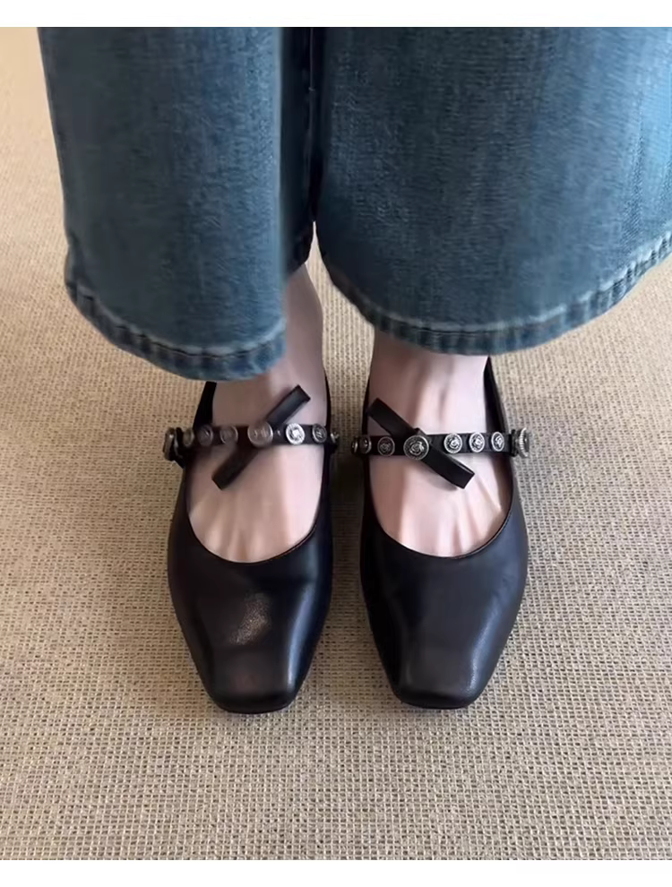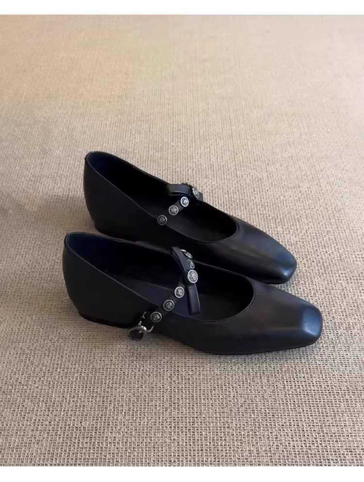 - Phiên bản da cừu ~ Giày Mary Jane đế vuông kiểu cổ điển có dây đeo kim loại tăng chiều cao dành cho nữ