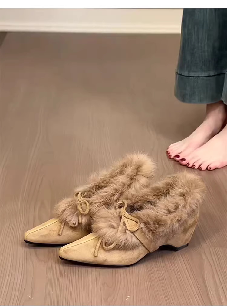 - Phiên bản da cừu ~ Giày Mary Jane kiểu Pháp nhẹ nhàng có nơ, giày đơn lót lông cừu tăng chiều cao bên trong bằng da lộn thanh lịch dành cho nữ