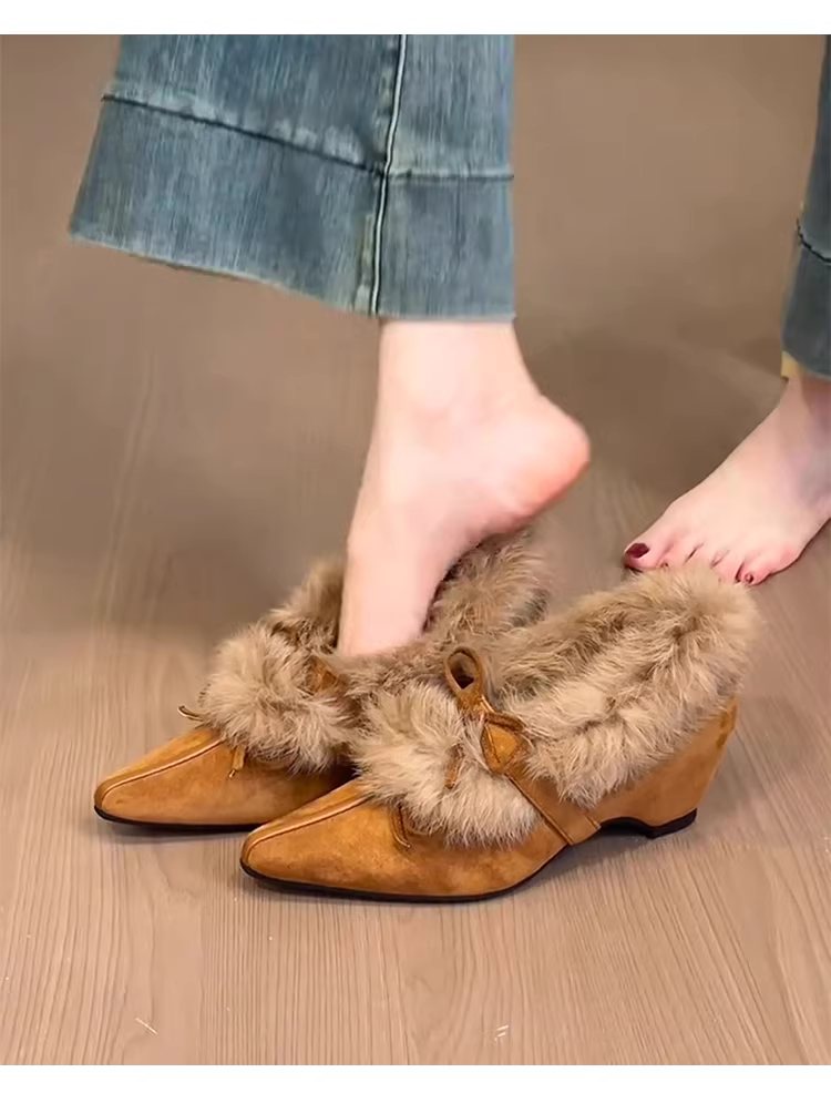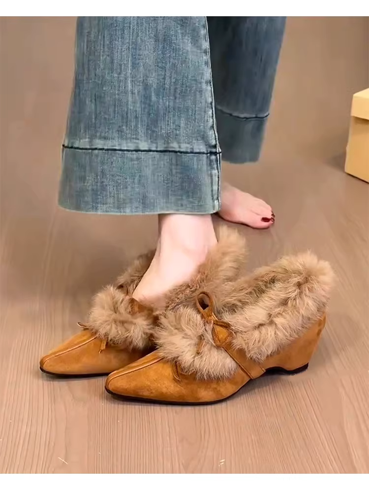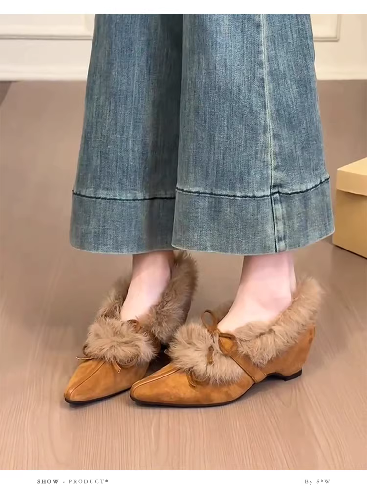 Phiên bản da cừu ~ Giày Mary Jane kiểu Pháp nhẹ nhàng có nơ, giày đơn lót lông cừu tăng chiều cao bên trong bằng da lộn thanh lịch dành cho nữ