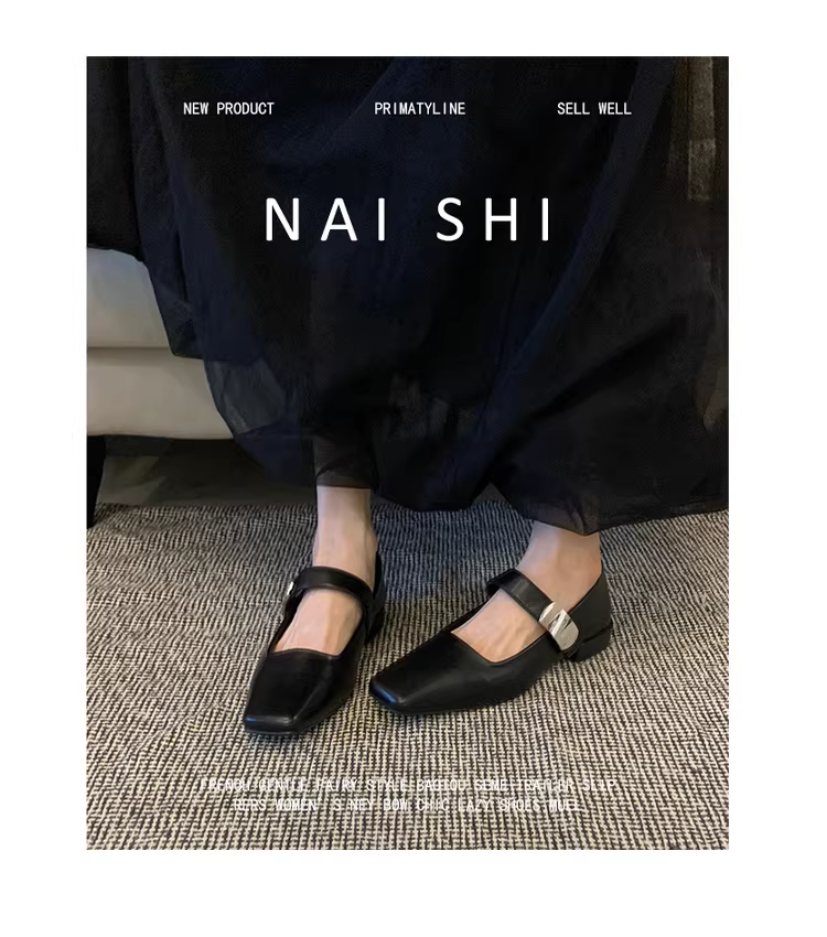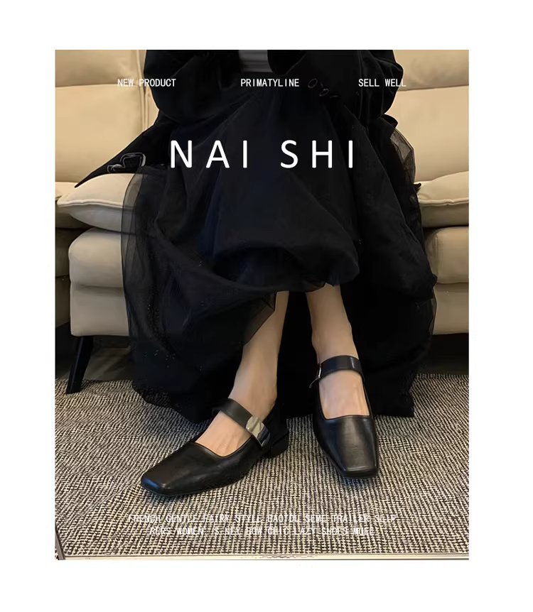 Phiên bản da cừu! Giày Mary Jane mũi vuông đi làm thanh lịch kiểu Pháp dành cho nữ với dây đeo khóa đơn, giày bệt màu đen đế thấp đa năng.