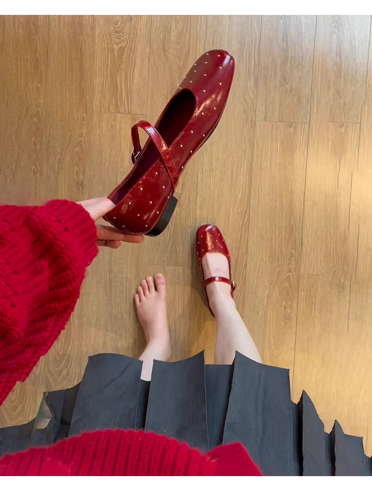 Phiên bản da cừu ~ Giày Mary Jane mũi vuông đính đinh màu đỏ dành cho nữ, kiểu dáng mới với khóa đơn, giày đế bằng cổ điển nông.