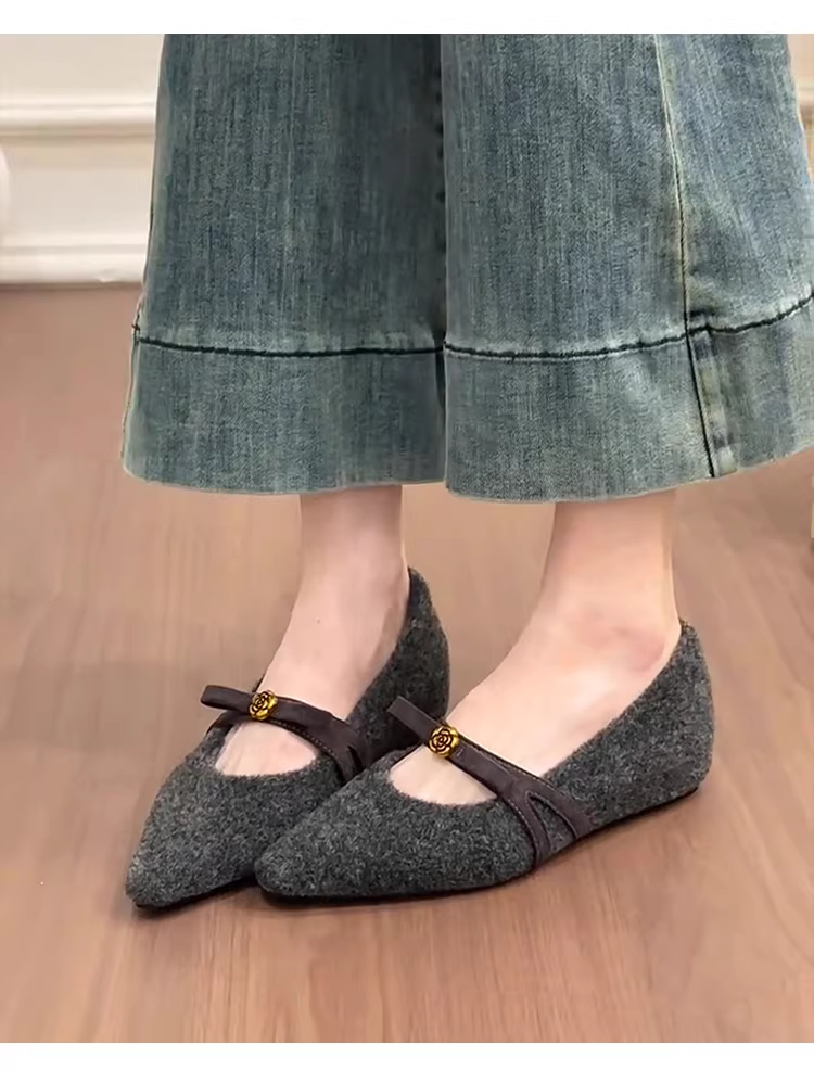 Phiên bản da cừu ~ Giày Mary Jane quai đơn cao cấp màu xám kiểu Pháp có hoa trà và nơ, giày đế bằng thon gọn dành cho nữ