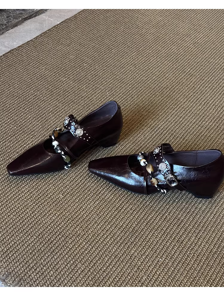 Phiên bản da cừu ~ Giày Mary Jane tăng chiều cao kiểu boho, thiết kế đinh tán độc đáo, mũi vuông, quai đơn dành cho nữ.