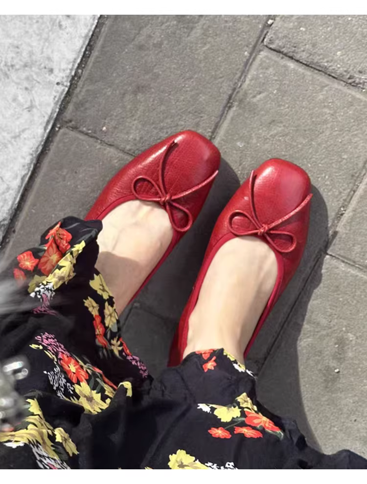 - Phiên bản da cừu~ Giày nhỏ màu đỏ thắt nơ kiểu Pháp dành cho nữ, giày đế bằng mũi tròn, da thật đế mềm, giày dạ hội cổ điển thanh lịch.