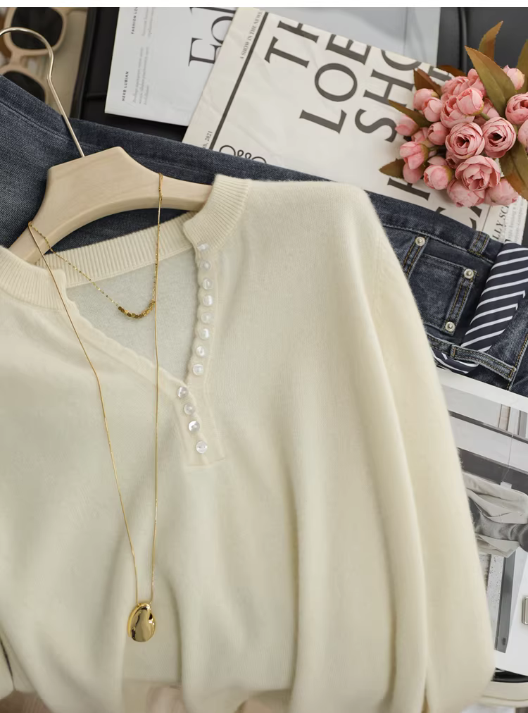 Phong cách của người nổi tiếng! Áo len cashmere hai sợi 28 sợi có cổ chữ V nửa mở, cài cúc, dáng rộng, áo len len dày dành cho nữ, mới cho mùa thu đông.