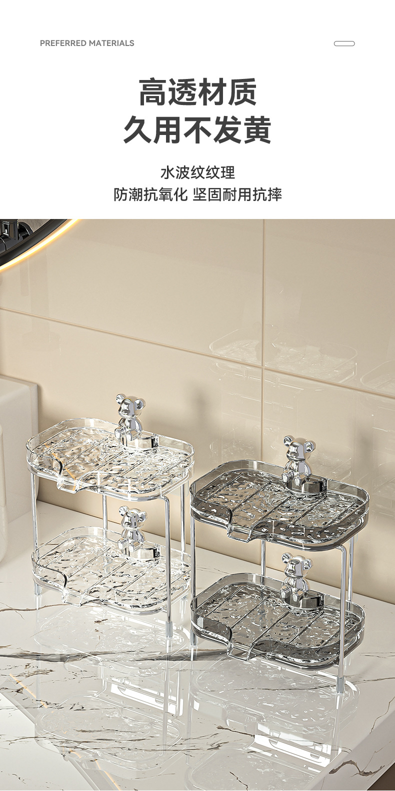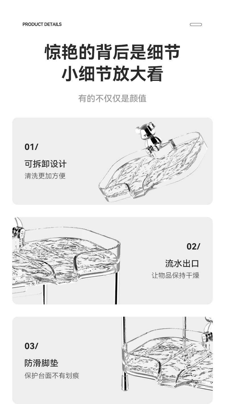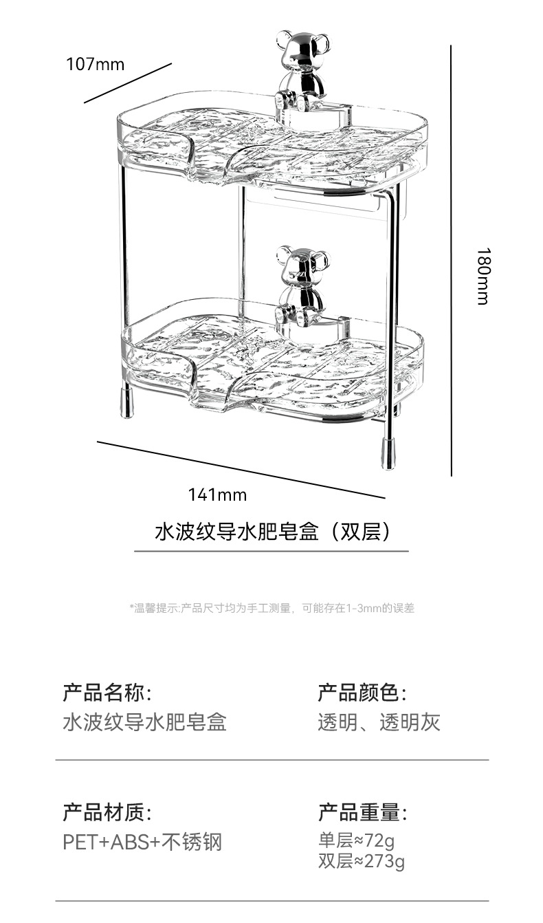 2、导水肥皂盒(双层)材质:PET+ABS+铁艺,盒子尺寸14.1*10.7*18cm,克重:268g,外箱尺寸56*32.3*47cm,40个/箱