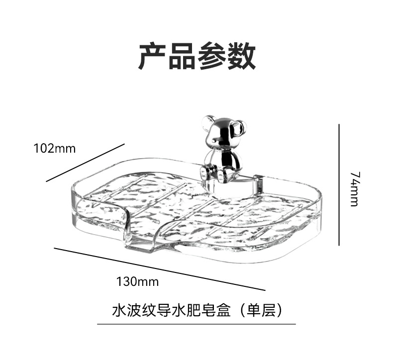1、导水肥皂盒(单层)材质:PET+ABS,盒子尺寸10.5*3.6*13.6cm,克重:68g,外箱尺寸55*32*56.7cm,160个/箱