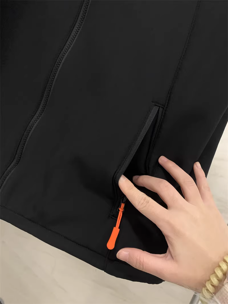 两侧是贴缝竖拉链口袋 橙色拉绳点缀 典型户外风格!