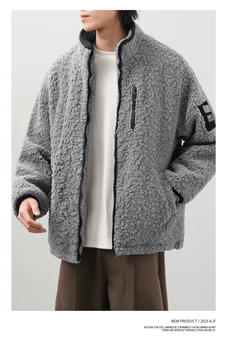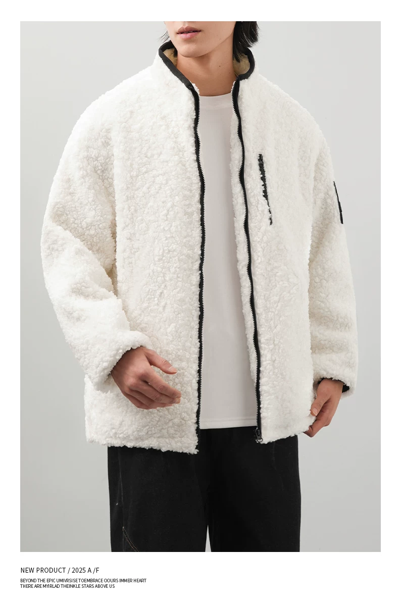 Áo khoác cotton cổ đứng kiểu Mỹ OMZM dành cho nam, áo khoác cotton dày dặn lót lông cừu mùa đông, áo khoác len cừu trắng.