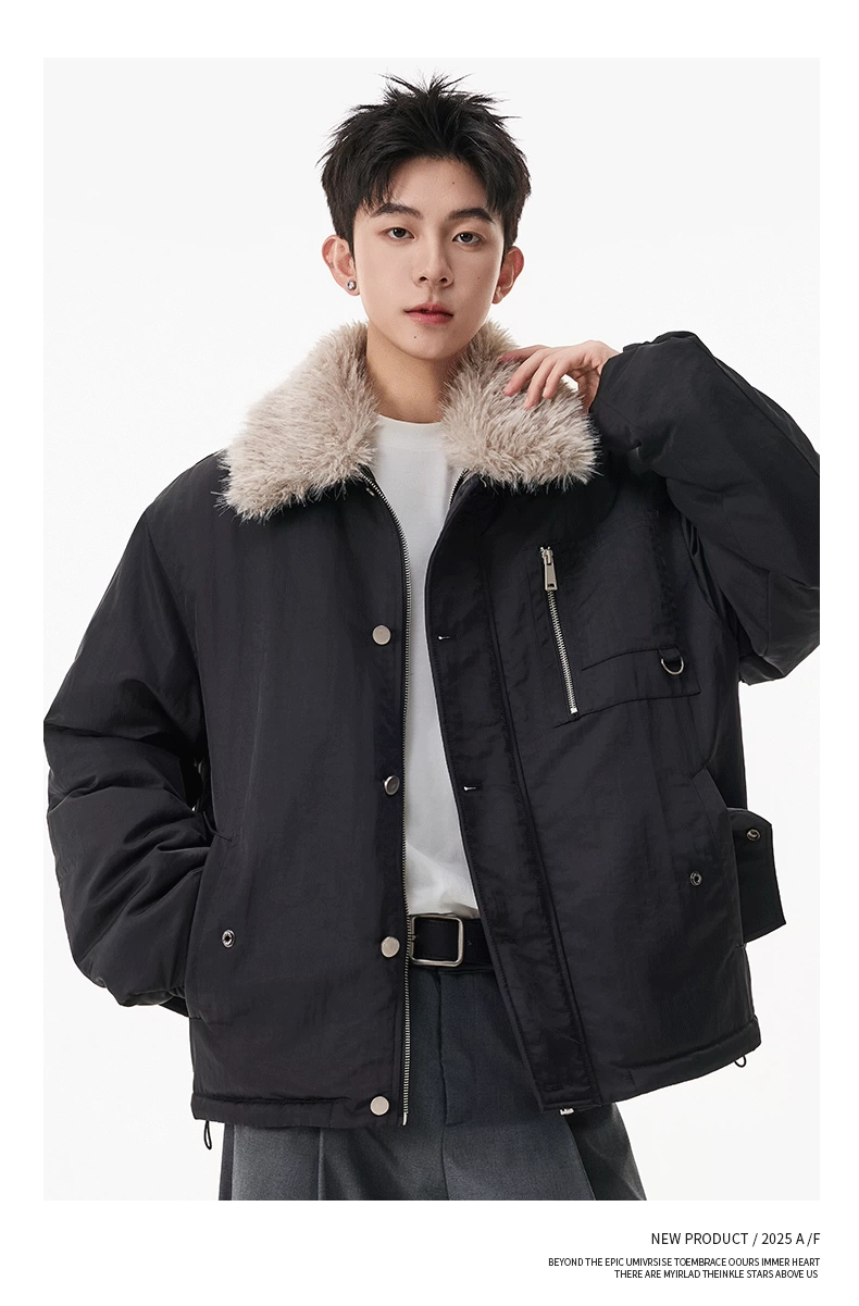 Áo khoác cotton kiểu Mỹ OMZM dành cho nam, áo khoác cotton dày dặn chống nhăn cổ điển mùa đông, dáng rộng có cổ lông.