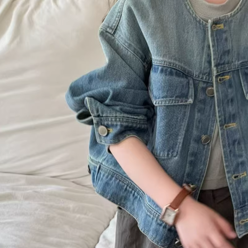 - Áo khoác denim nữ 25 xuân thu quần áo trẻ em mới mùa xuân áo khoác cổ tròn đơn giản phong cách Hàn Quốc áo thường ngày hợp thời trang