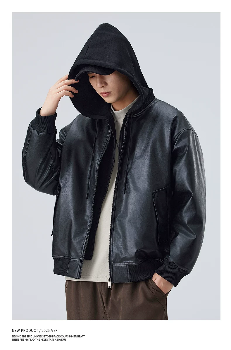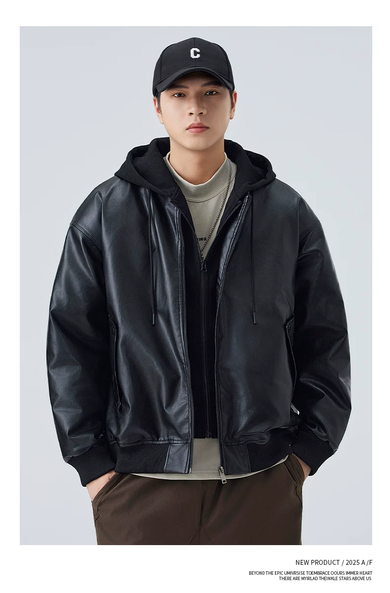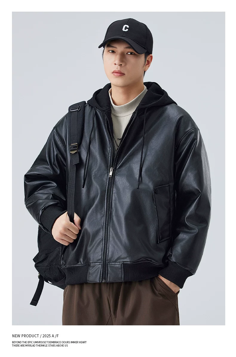 Áo khoác giả hai mảnh mới của OMZM dành cho nam giới, áo khoác dày dặn ấm áp theo phong cách cổ điển mùa đông, áo khoác da có mũ trùm đầu dành cho cặp đôi phong cách biker