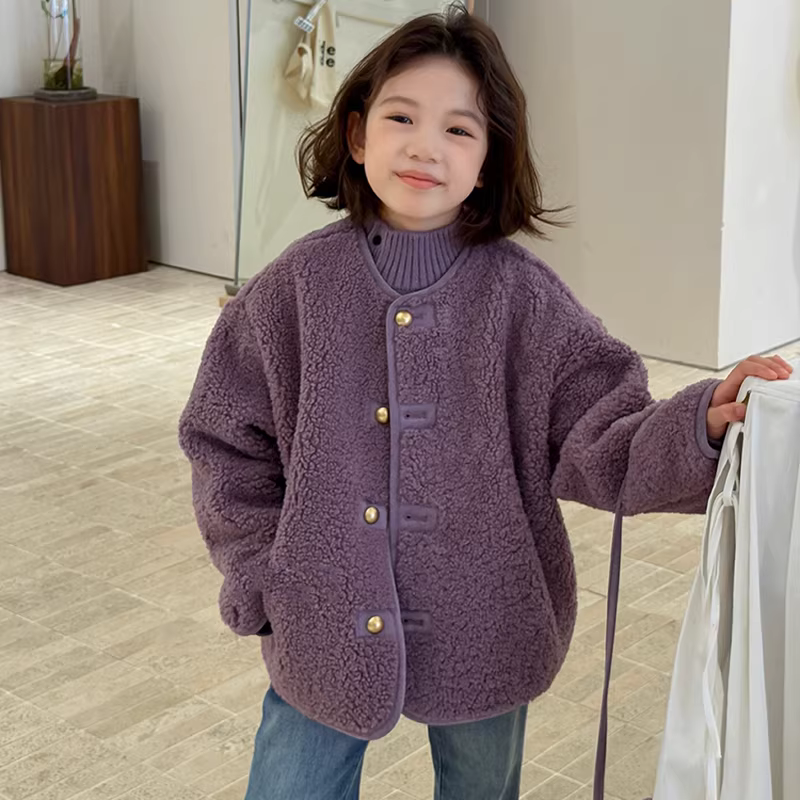 - Áo khoác len cừu màu tím khói có khuy chéo dành cho bé gái, áo khoác dày giữ ấm, kiểu dáng mùa đông 25, quần ống loe lót lông cừu cổ điển cho trẻ lớn