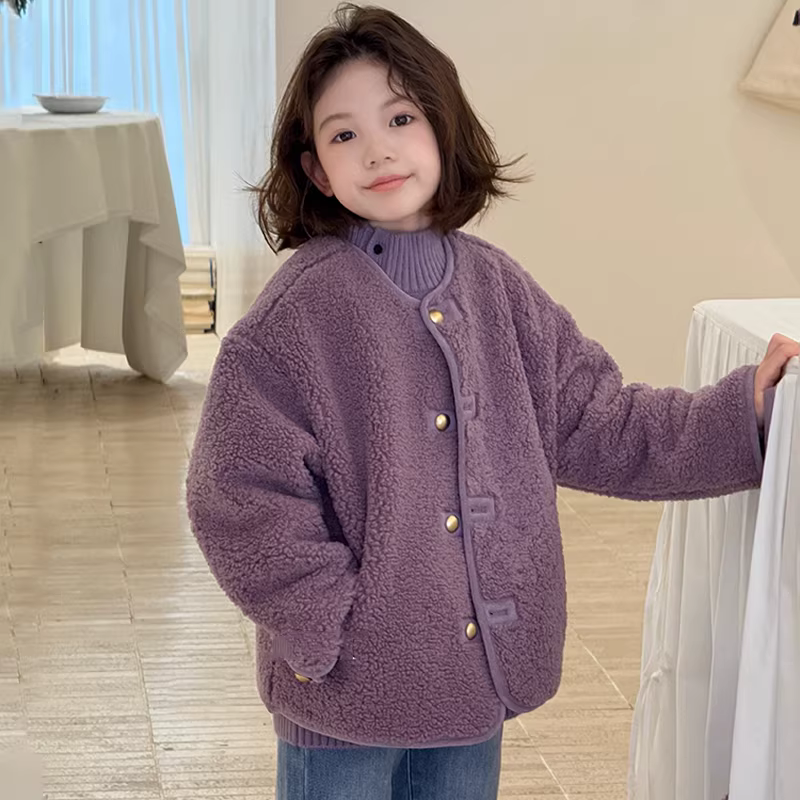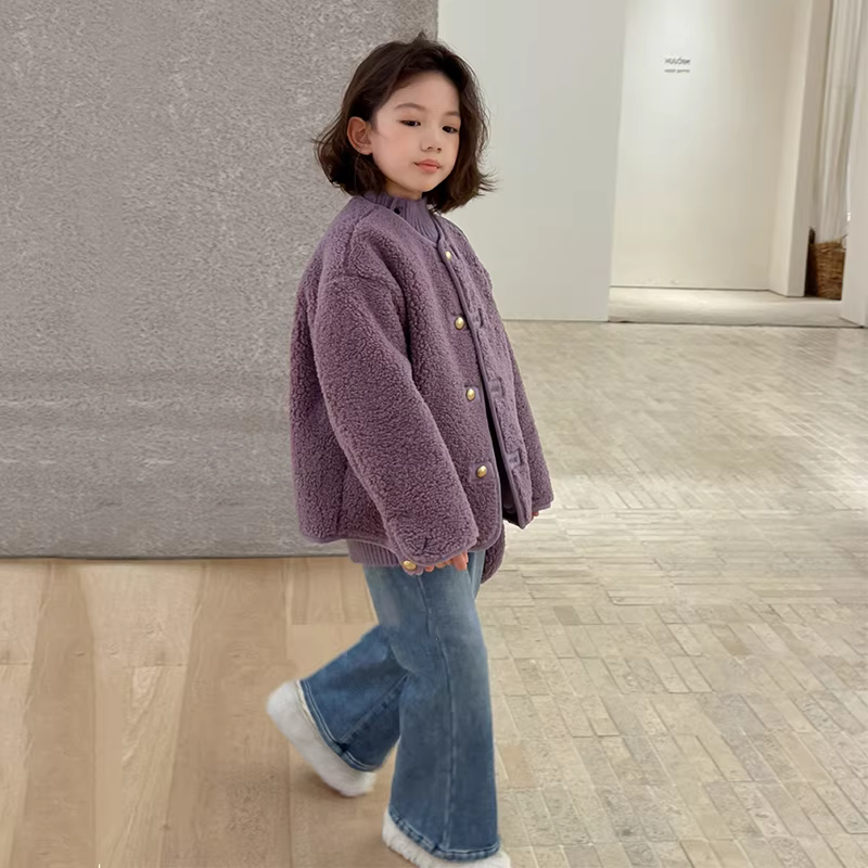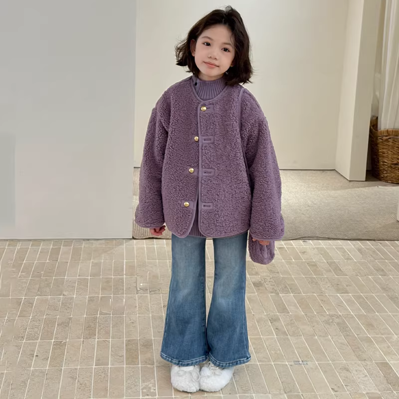 Áo khoác len cừu màu tím khói có khuy chéo dành cho bé gái, áo khoác dày giữ ấm, kiểu dáng mùa đông 25, quần ống loe lót lông cừu cổ điển cho trẻ lớn