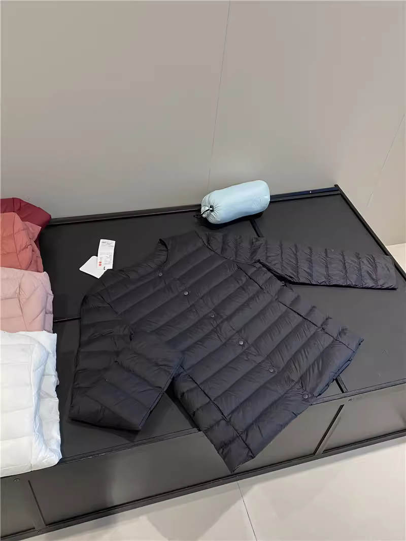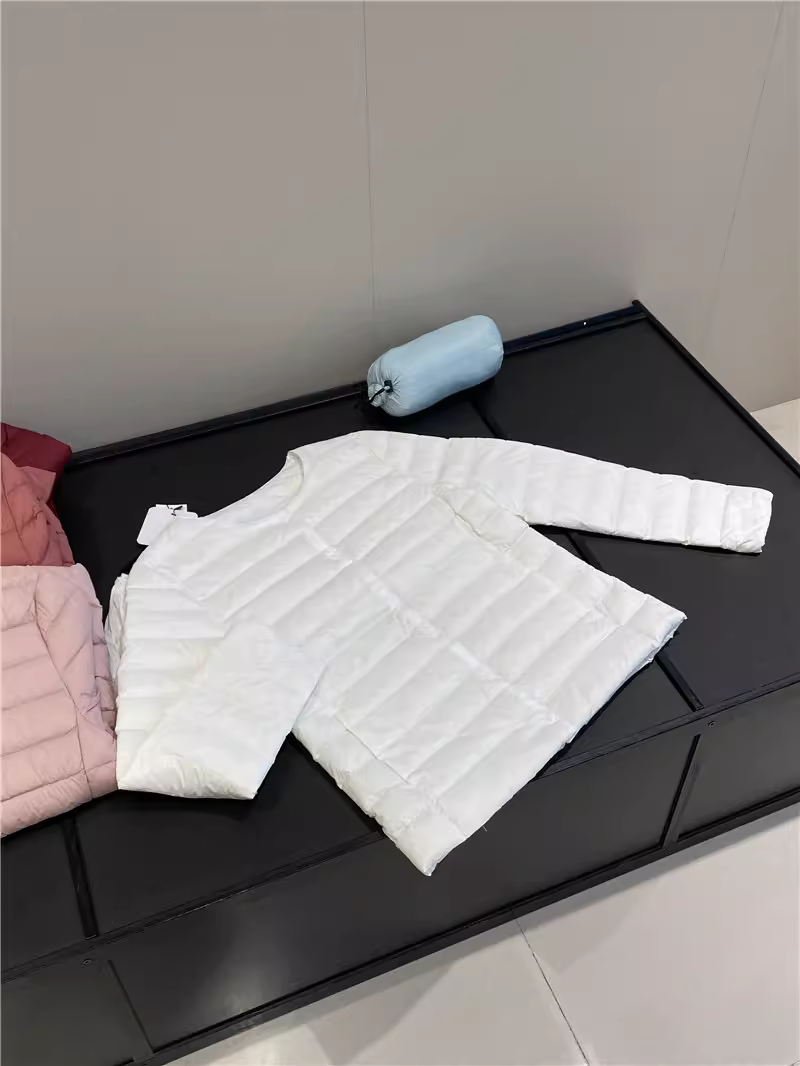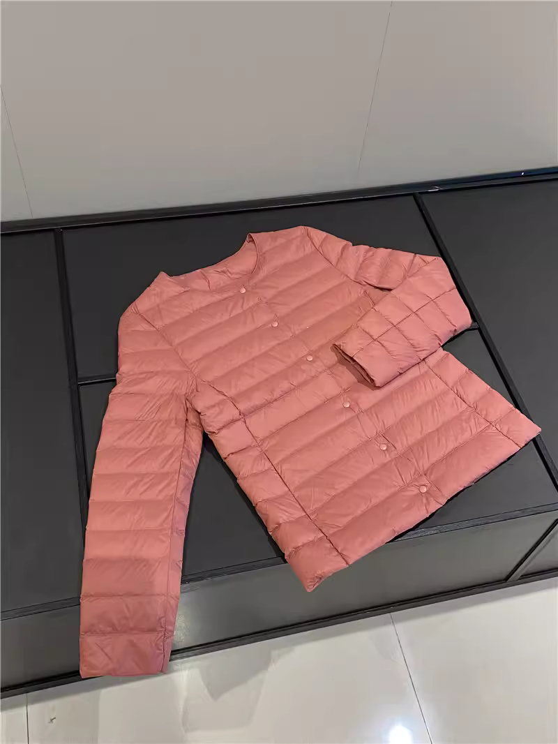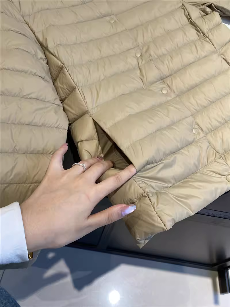 Áo khoác lông vũ Don Quixote 90% lông vịt trắng! Áo khoác lông vũ màu trơn cổ tròn nhẹ và ấm áp cho mùa thu đông, có túi đựng đồ dành cho nữ.