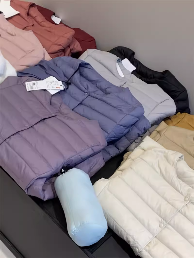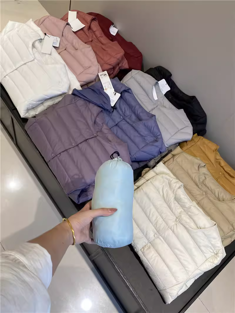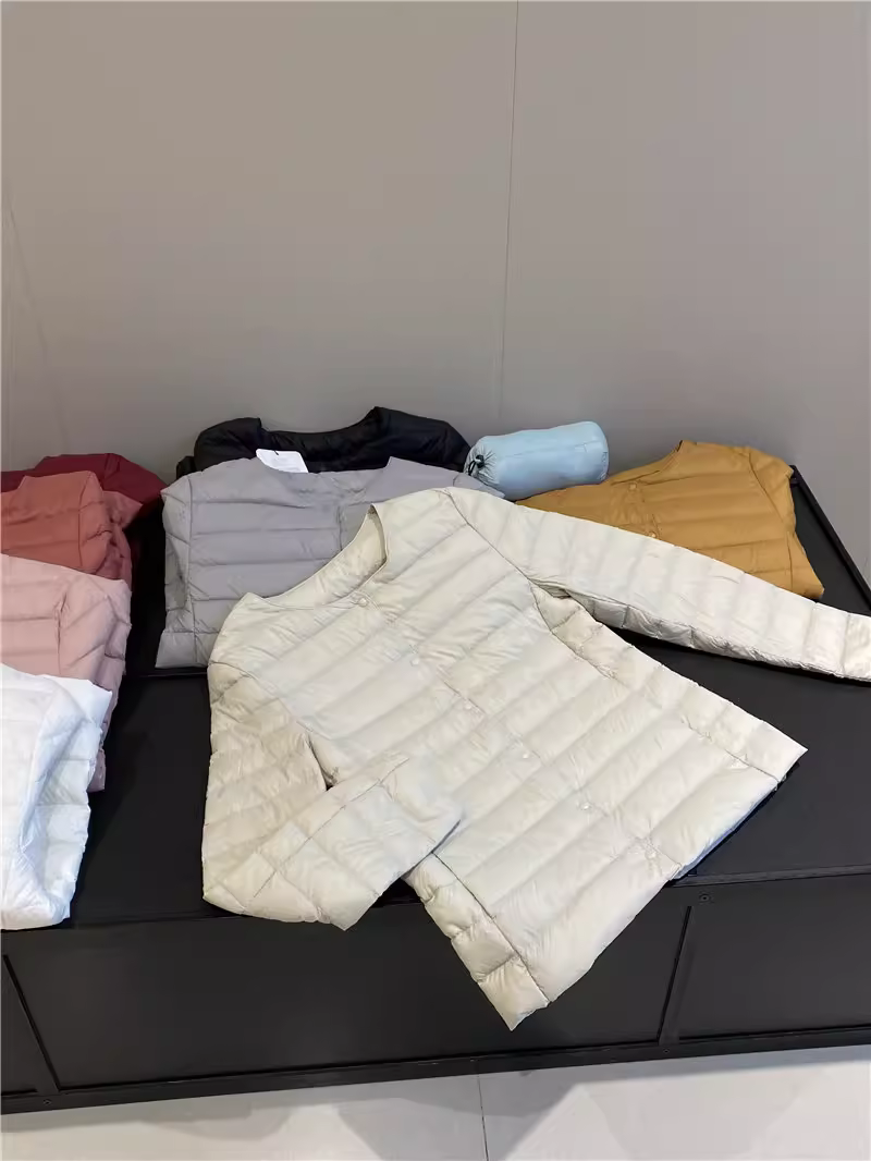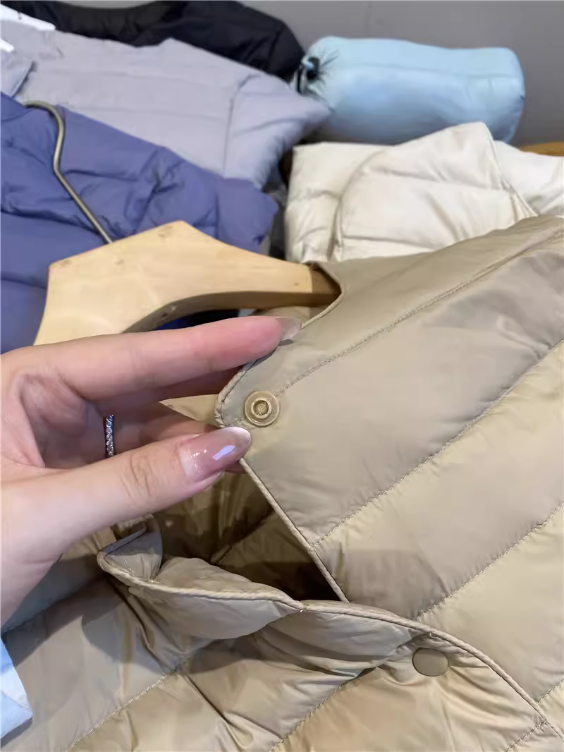 - Áo khoác lông vũ Don Quixote 90% lông vịt trắng! Áo khoác lông vũ màu trơn cổ tròn nhẹ và ấm áp cho mùa thu đông, có túi đựng đồ dành cho nữ.