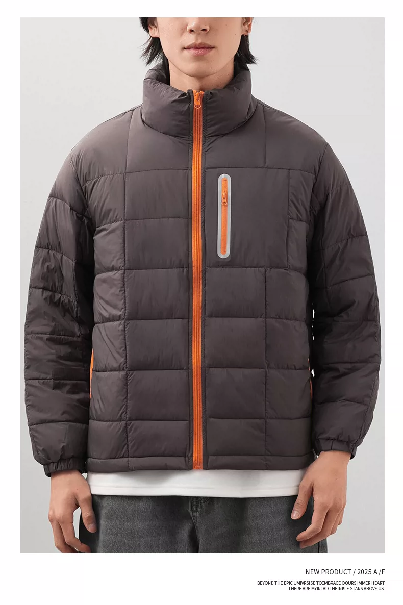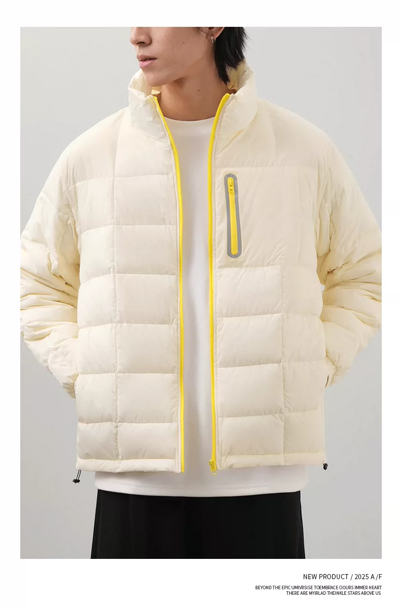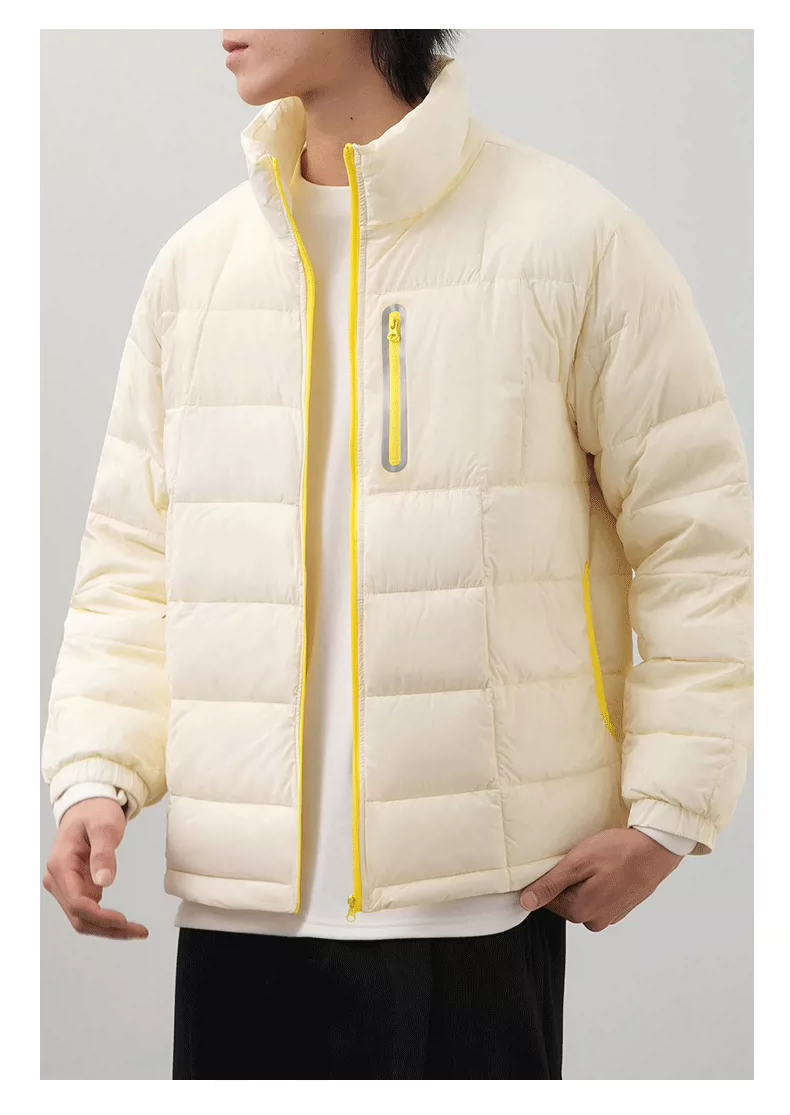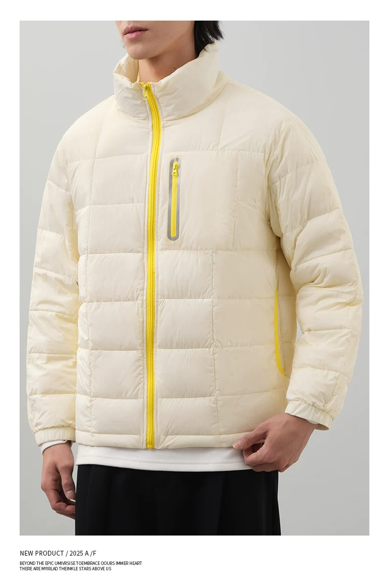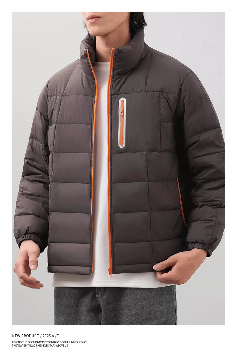 Áo khoác lông vũ OMZM90 dành cho nam, chất liệu gân, nhẹ và dày dặn cho mùa đông, áo phao ấm áp với cổ đứng màu tương phản.
