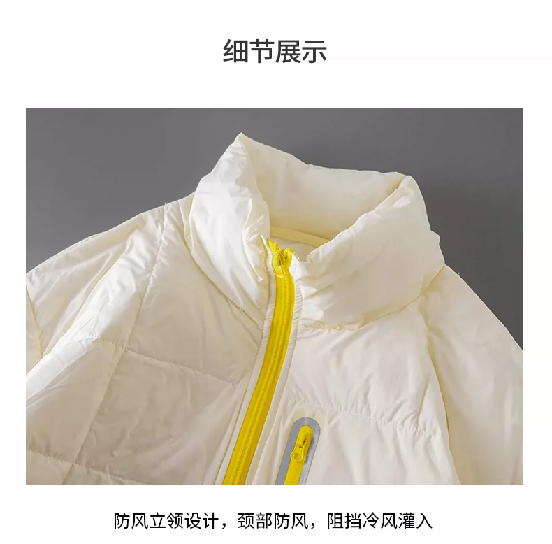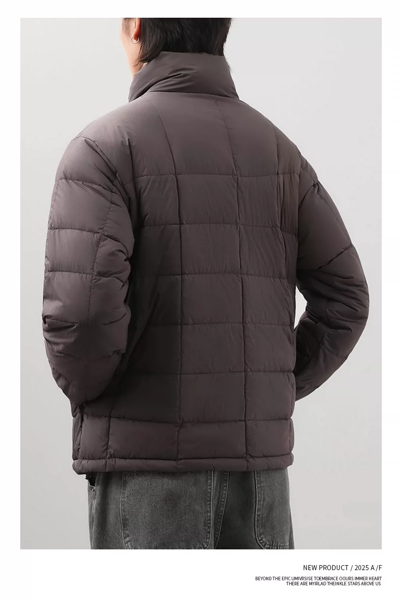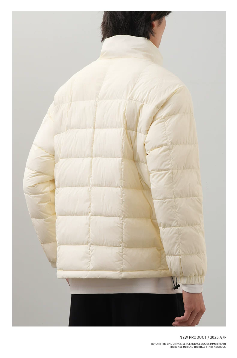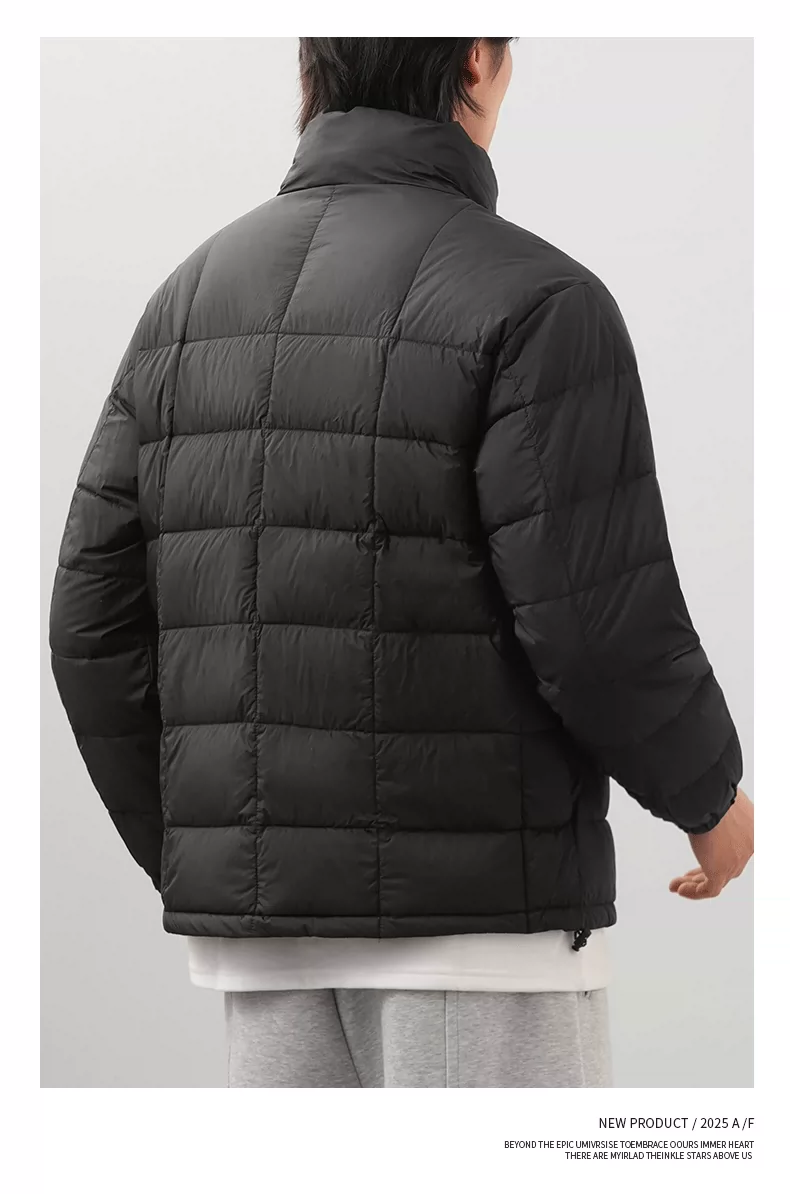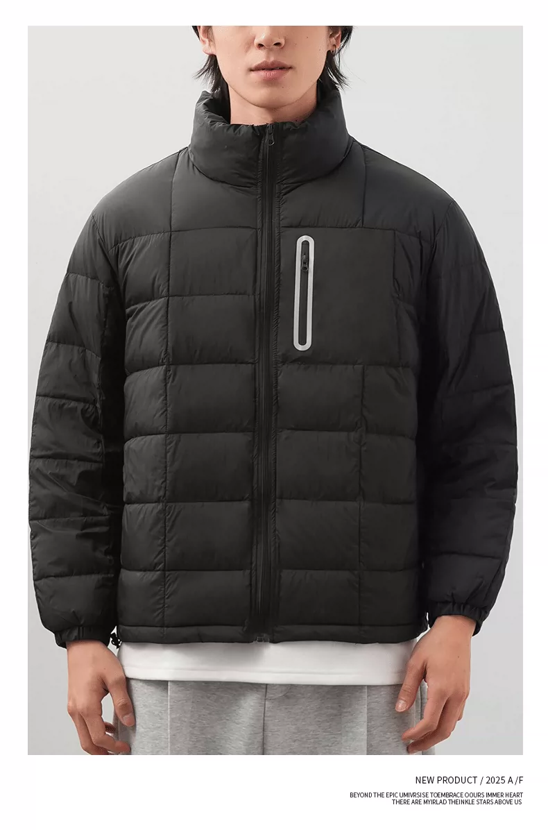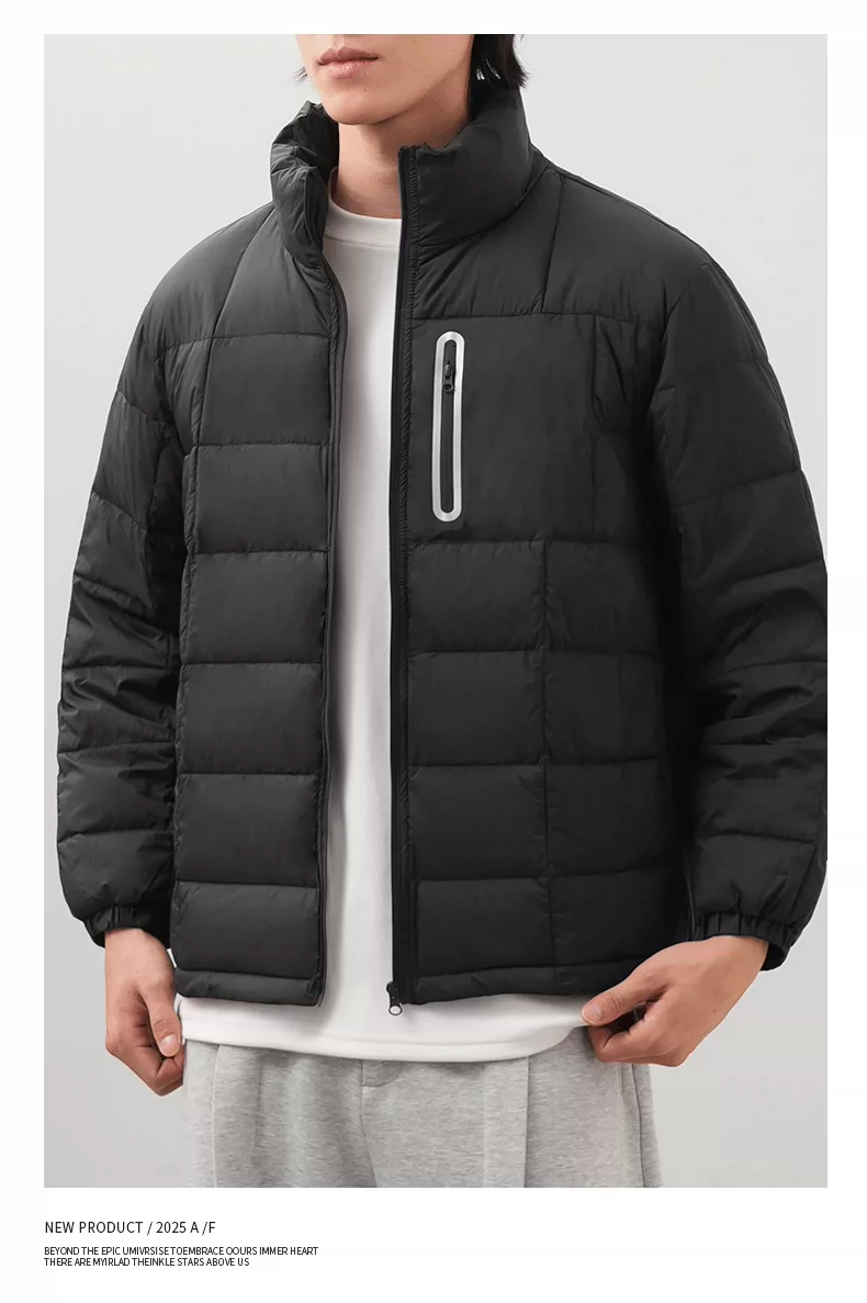Áo khoác lông vũ OMZM90 dành cho nam, chất liệu gân, nhẹ và dày dặn cho mùa đông, áo phao ấm áp với cổ đứng màu tương phản.