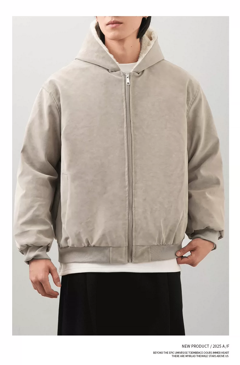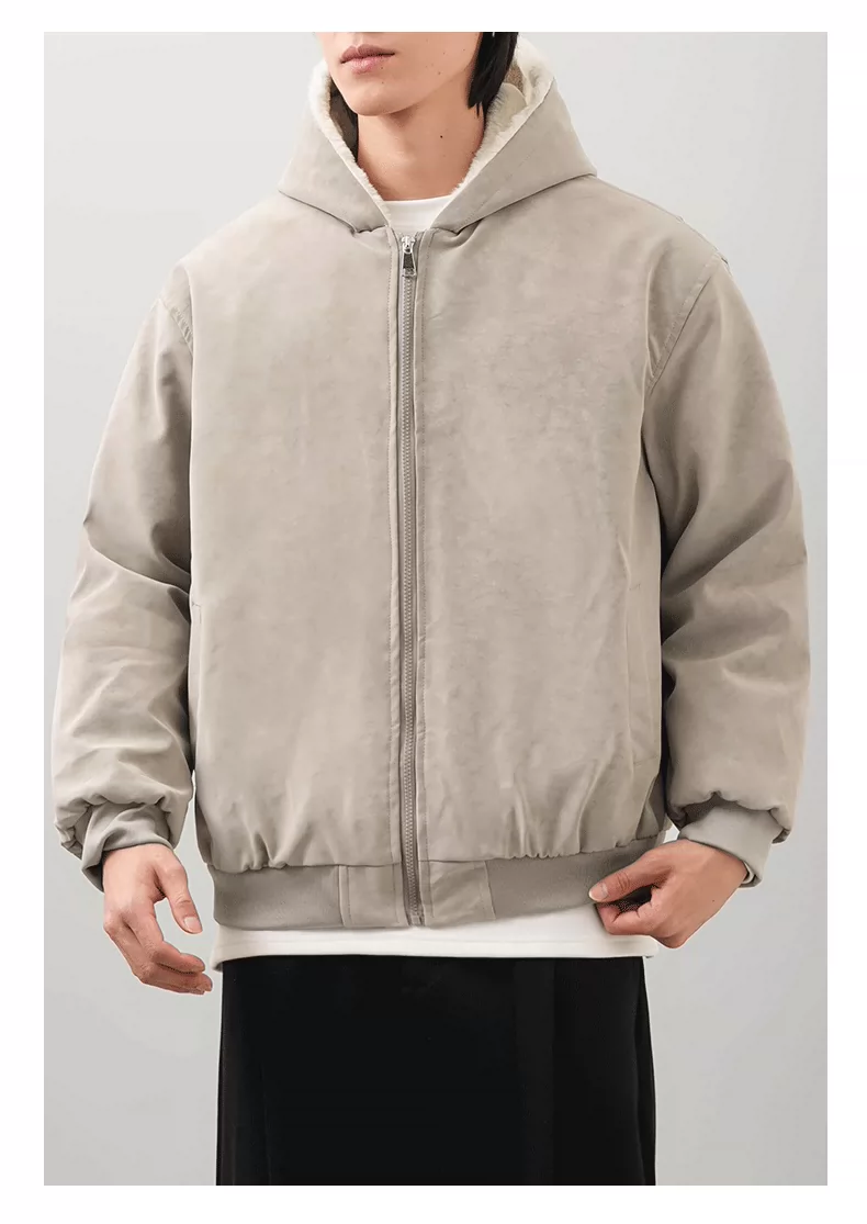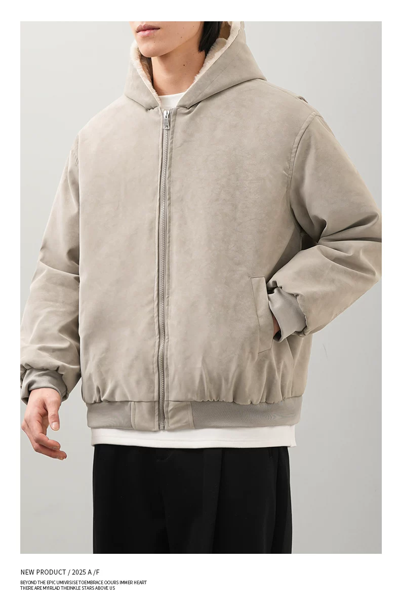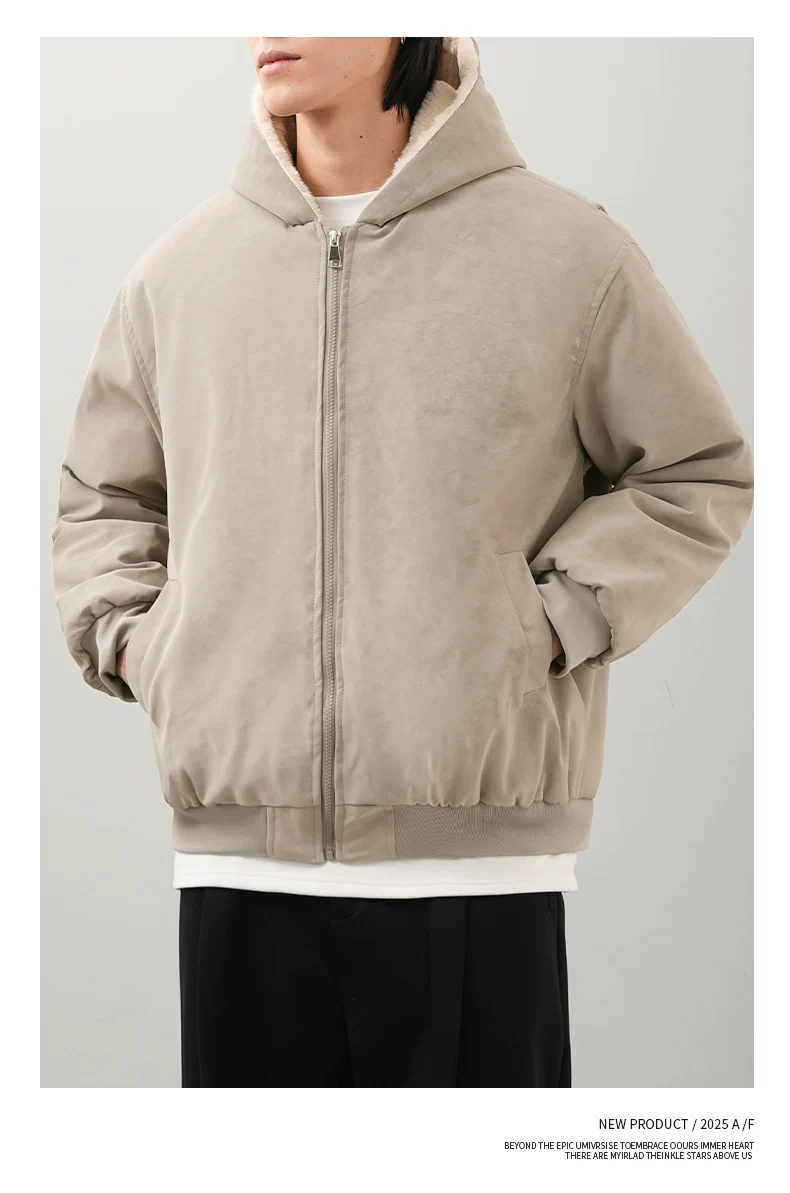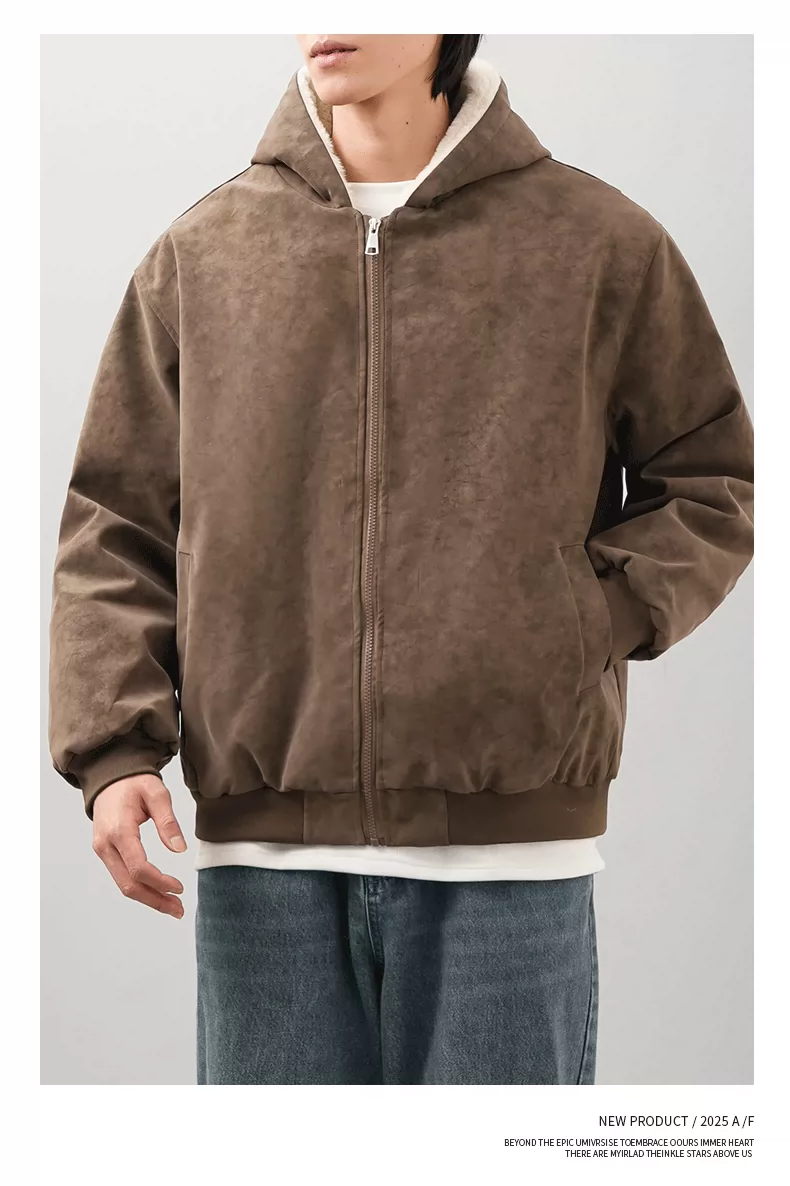 - Áo khoác nam OMZM mùa đông bằng da PU dày dặn, có mũ trùm đầu, khóa kéo, lót lông cừu, phong cách cổ điển Anh.