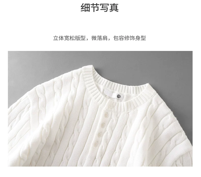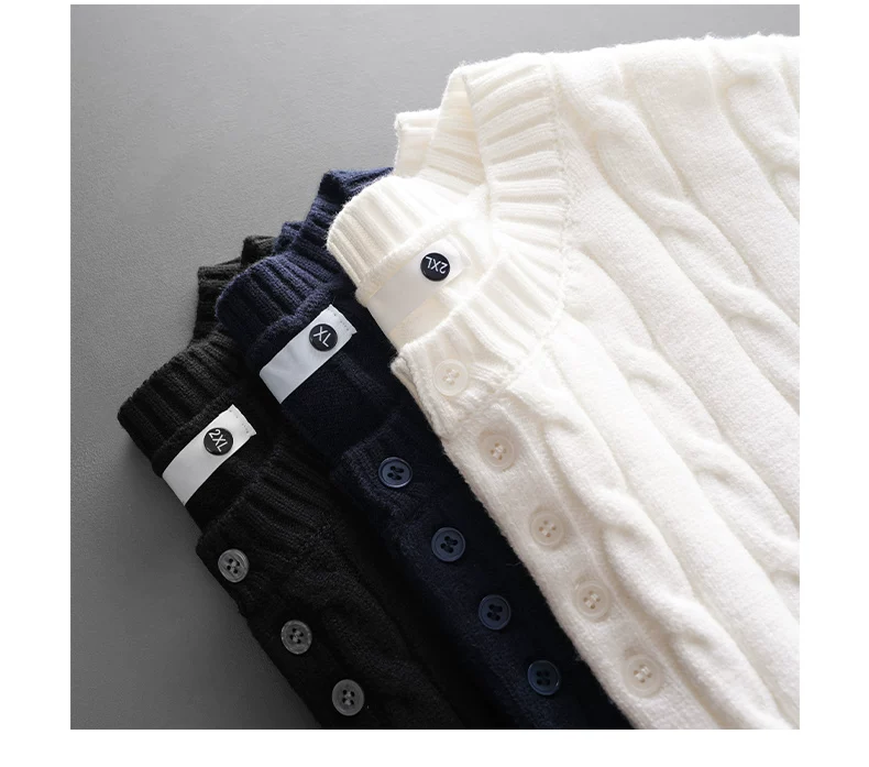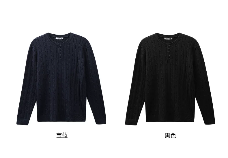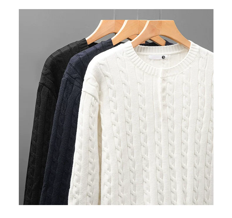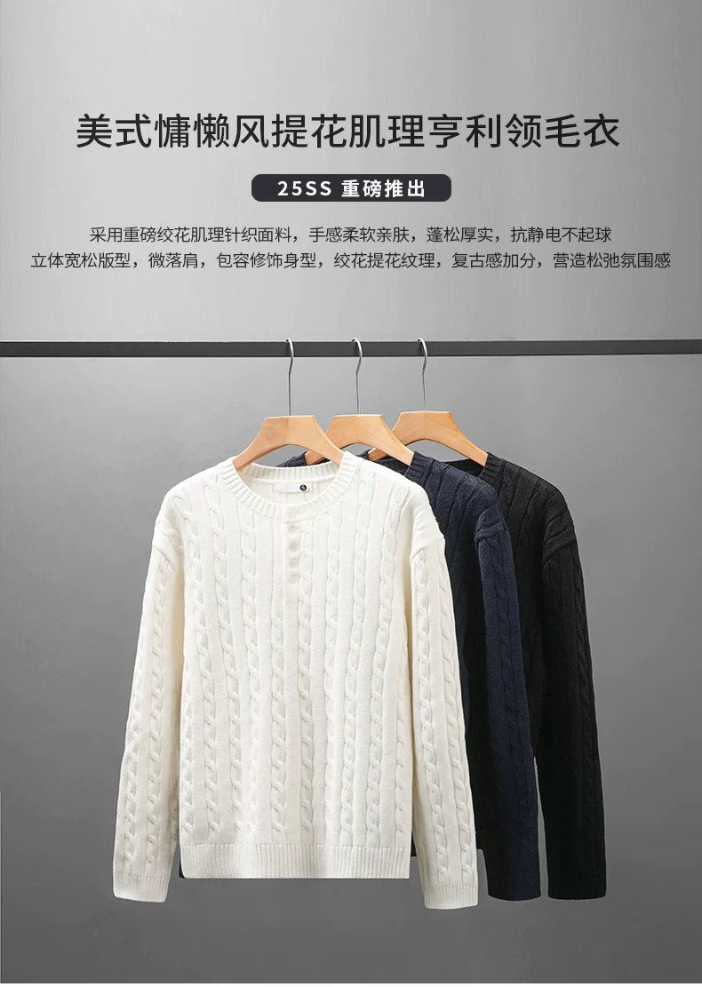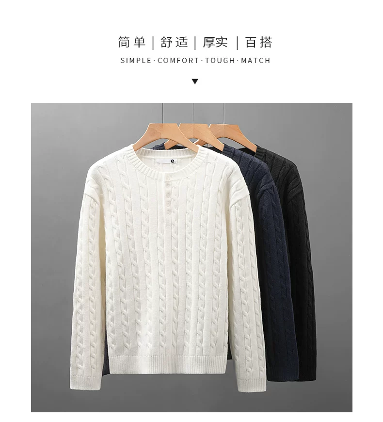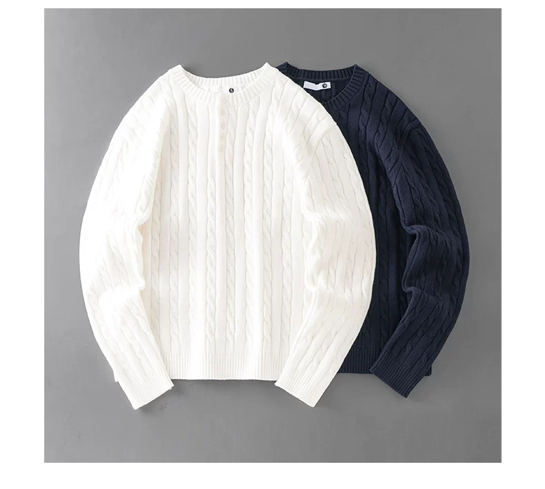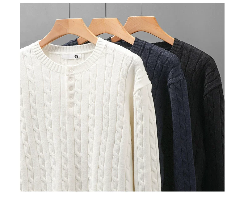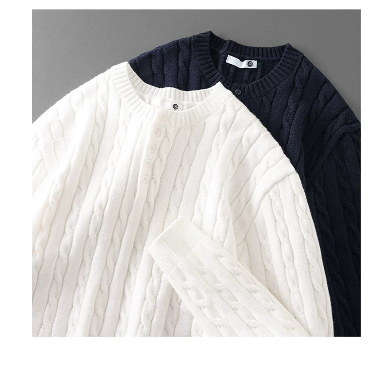 - Áo len chất liệu jacquard hạng nặng OMZM dành cho nam, mùa thu đông, kiểu cổ henley màu trơn phong cách retro Mỹ, áo len dáng rộng