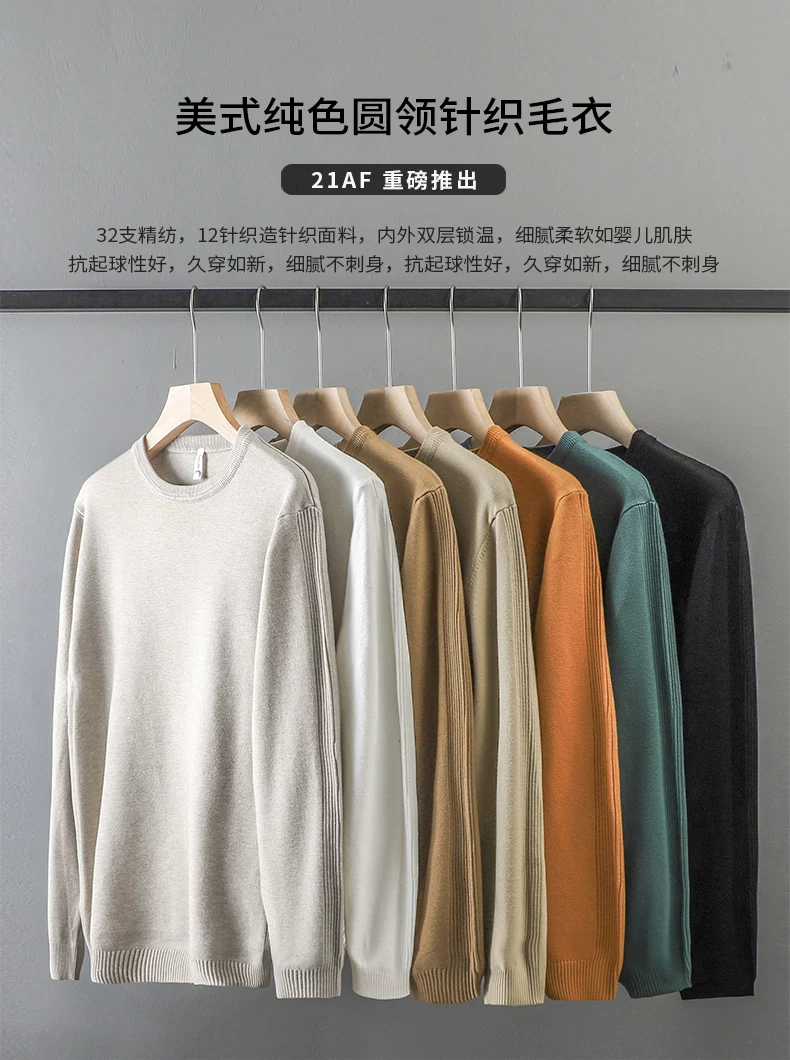 Áo len cổ tròn màu trơn kiểu Mỹ dành cho nam, áo len dệt kim đa năng hợp thời trang thu đông mới dành cho nam.