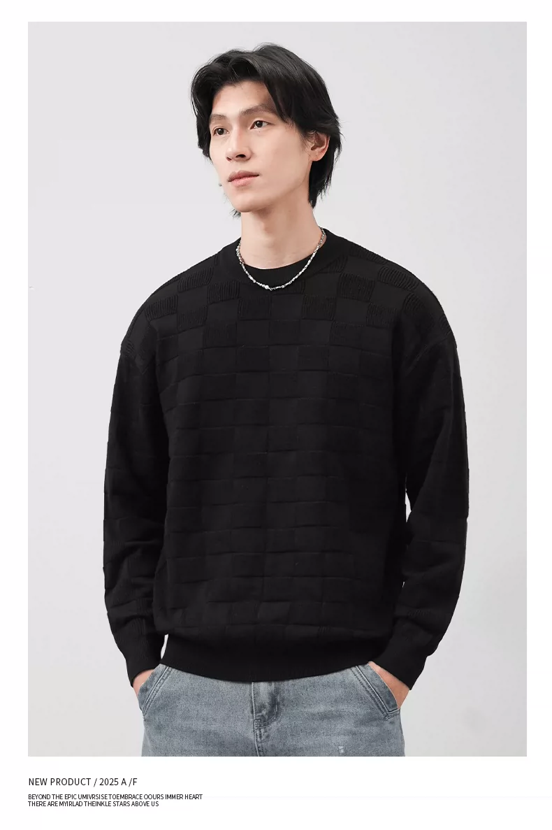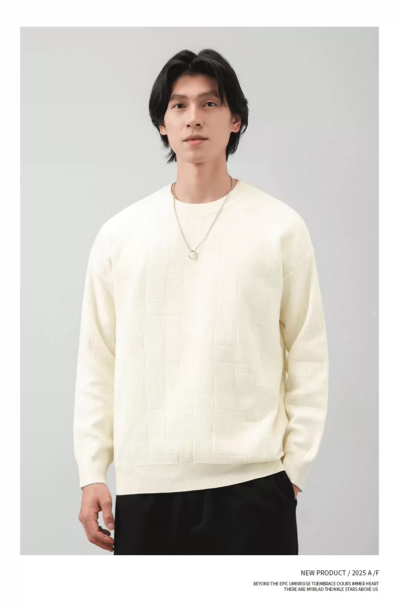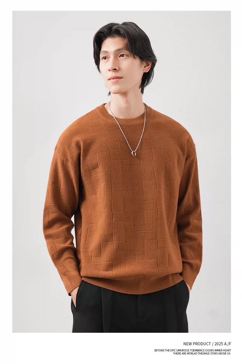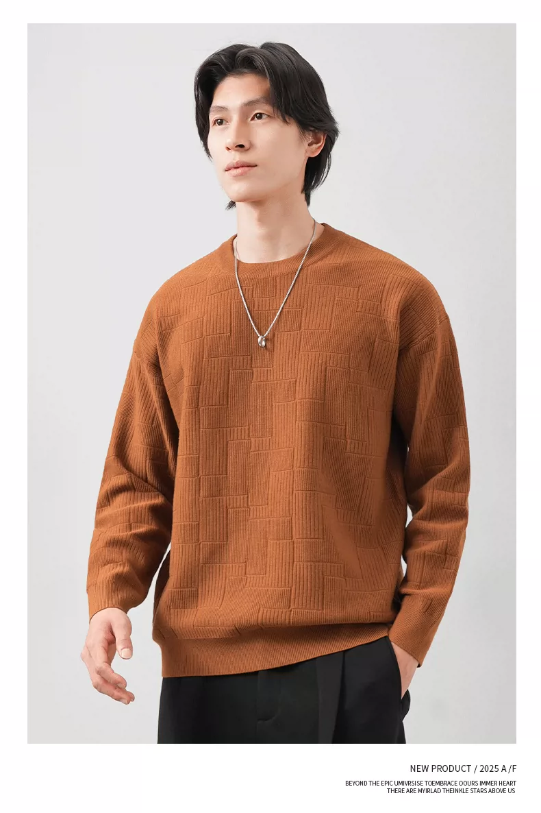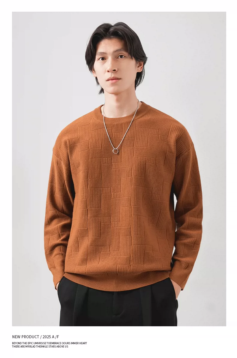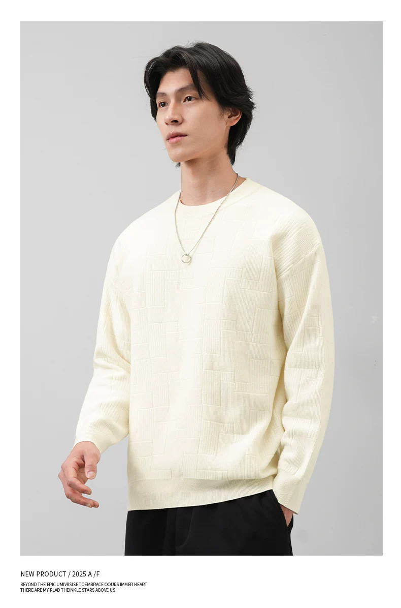Áo len cổ tròn phong cách tiền cổ điển OMZM dành cho nam, áo lót dày giữ ấm mùa thu với chất liệu dệt kim có vân.