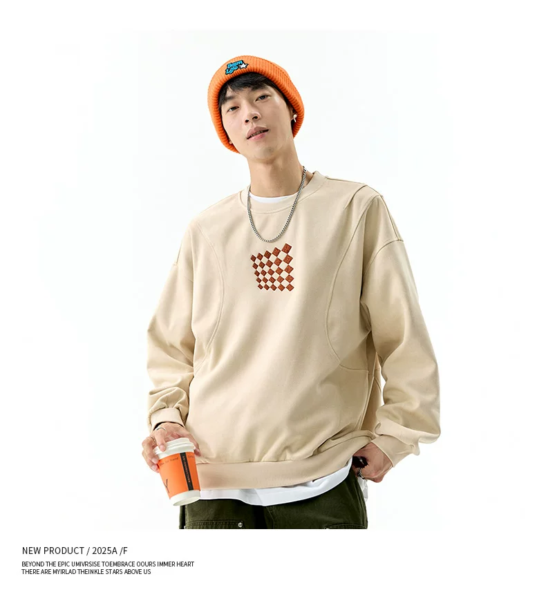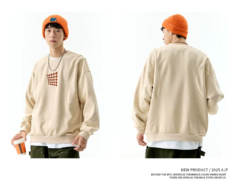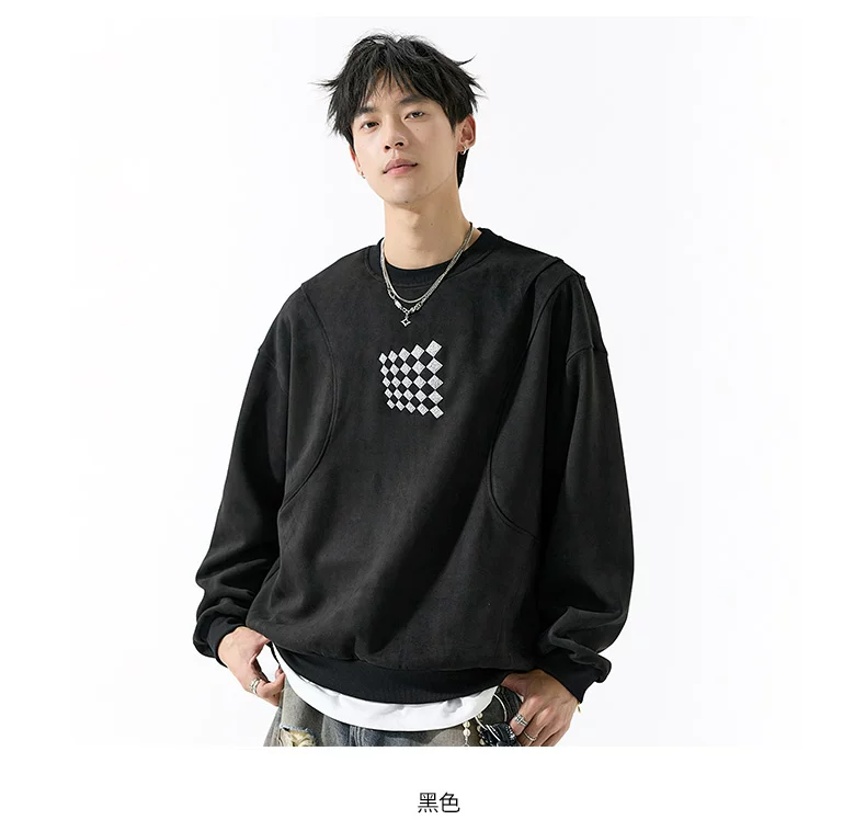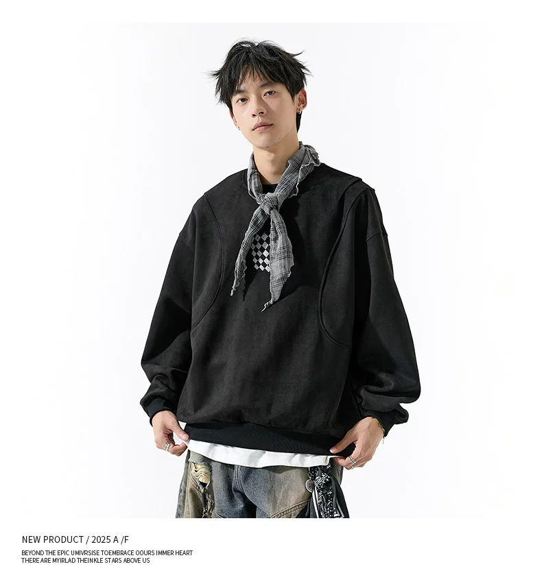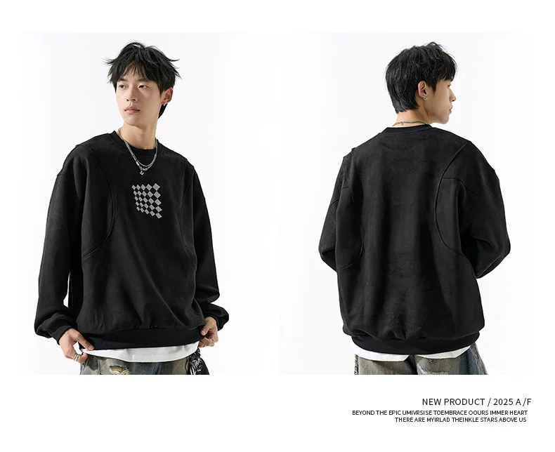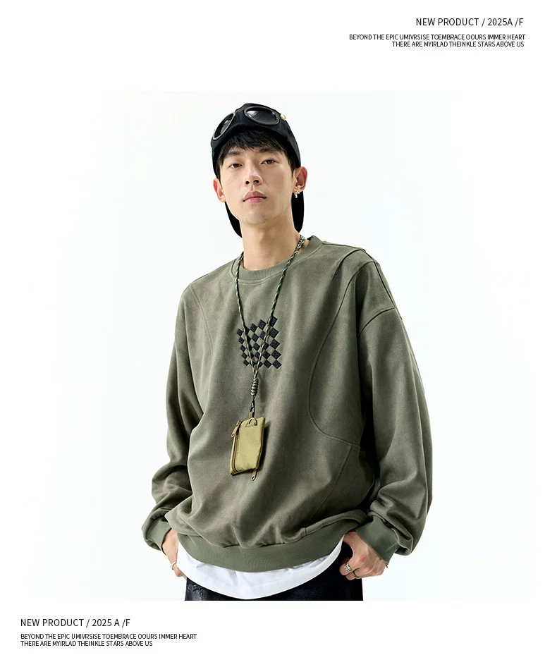 Áo len da lộn hạng nặng OMZM380G dành cho nam, áo sơ mi dài tay cổ tròn thêu chắp vá phong cách Mỹ mùa thu
