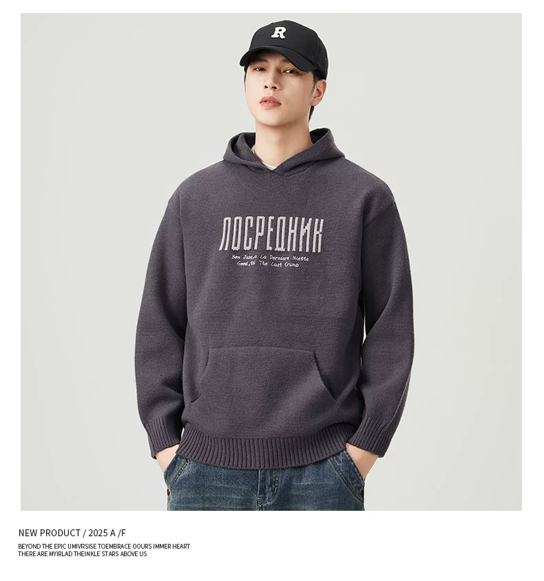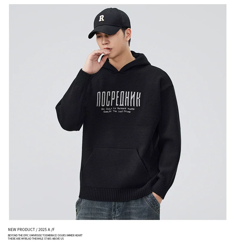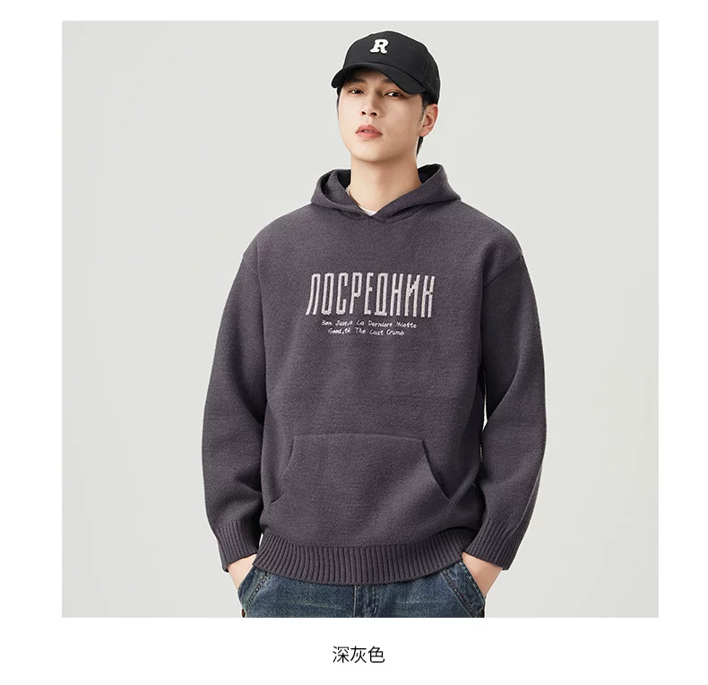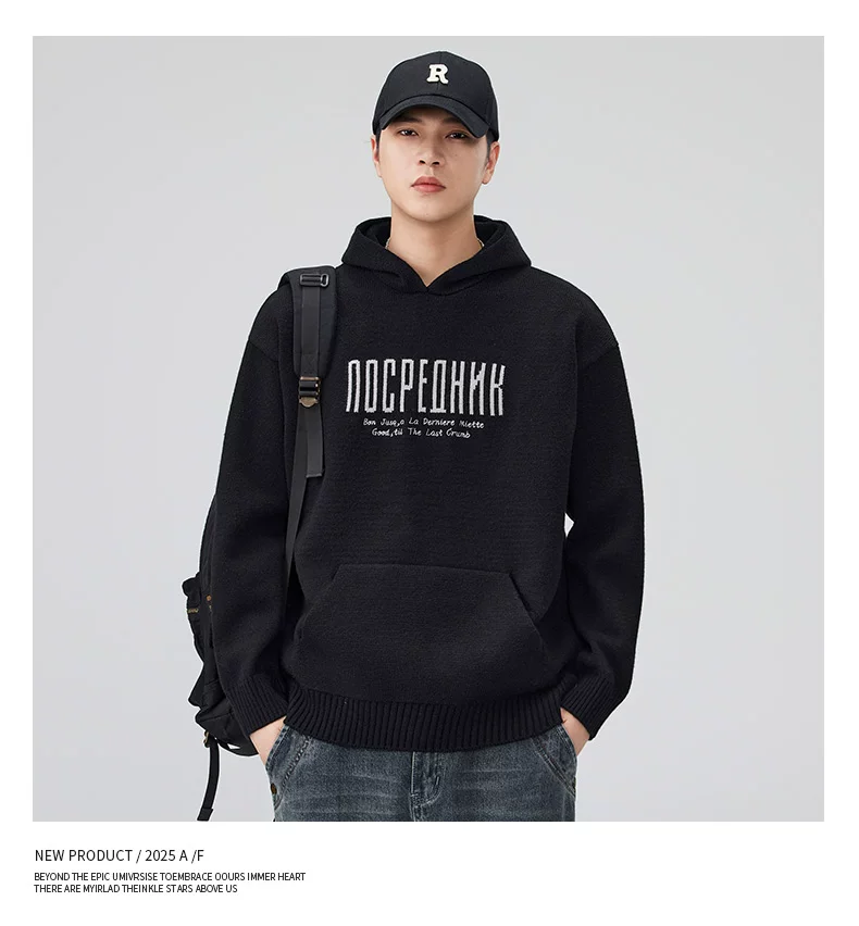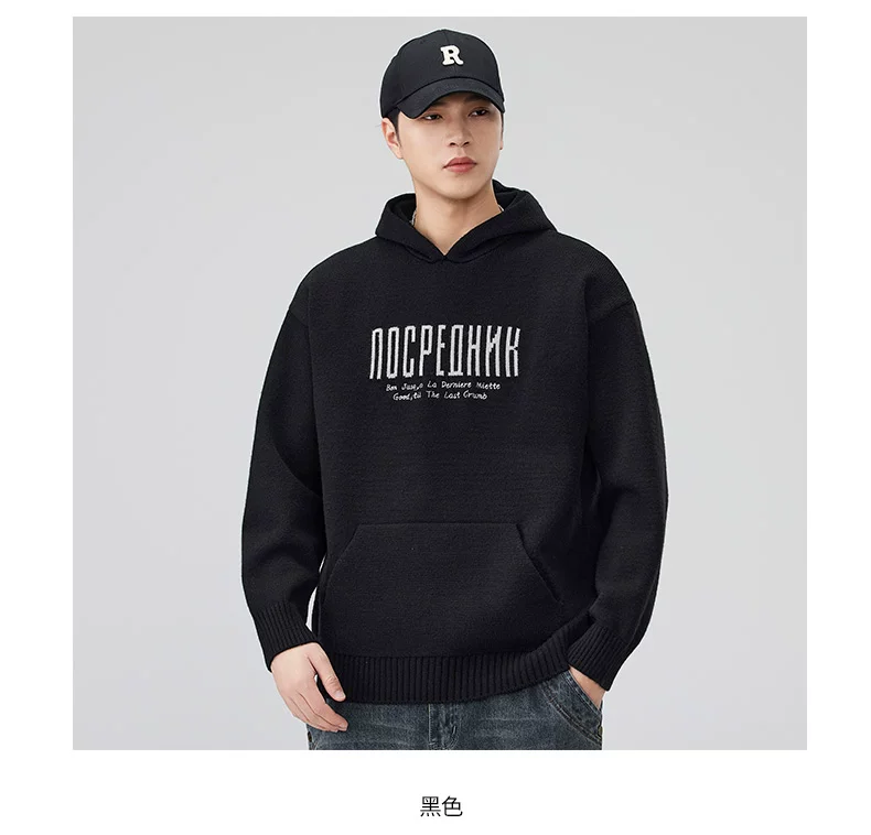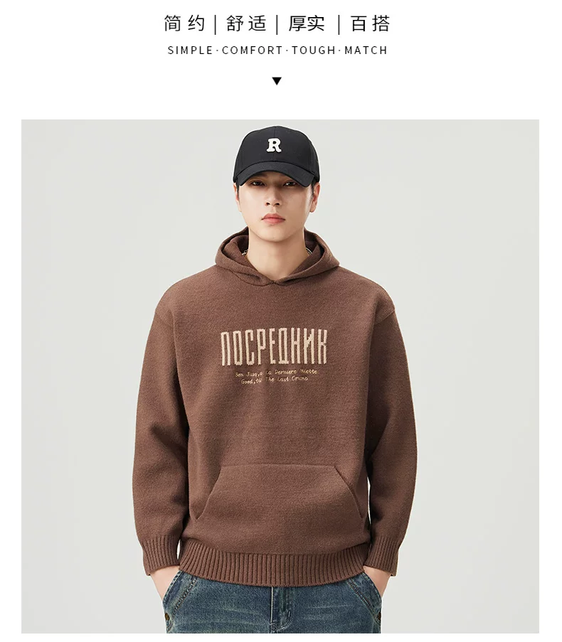- Áo len dệt kim có mũ trùm đầu OMZM dành cho nam, áo len chui đầu in chữ nặng kiểu Mỹ mùa thu đông, áo thun chui đầu kiểu dáng lười biếng