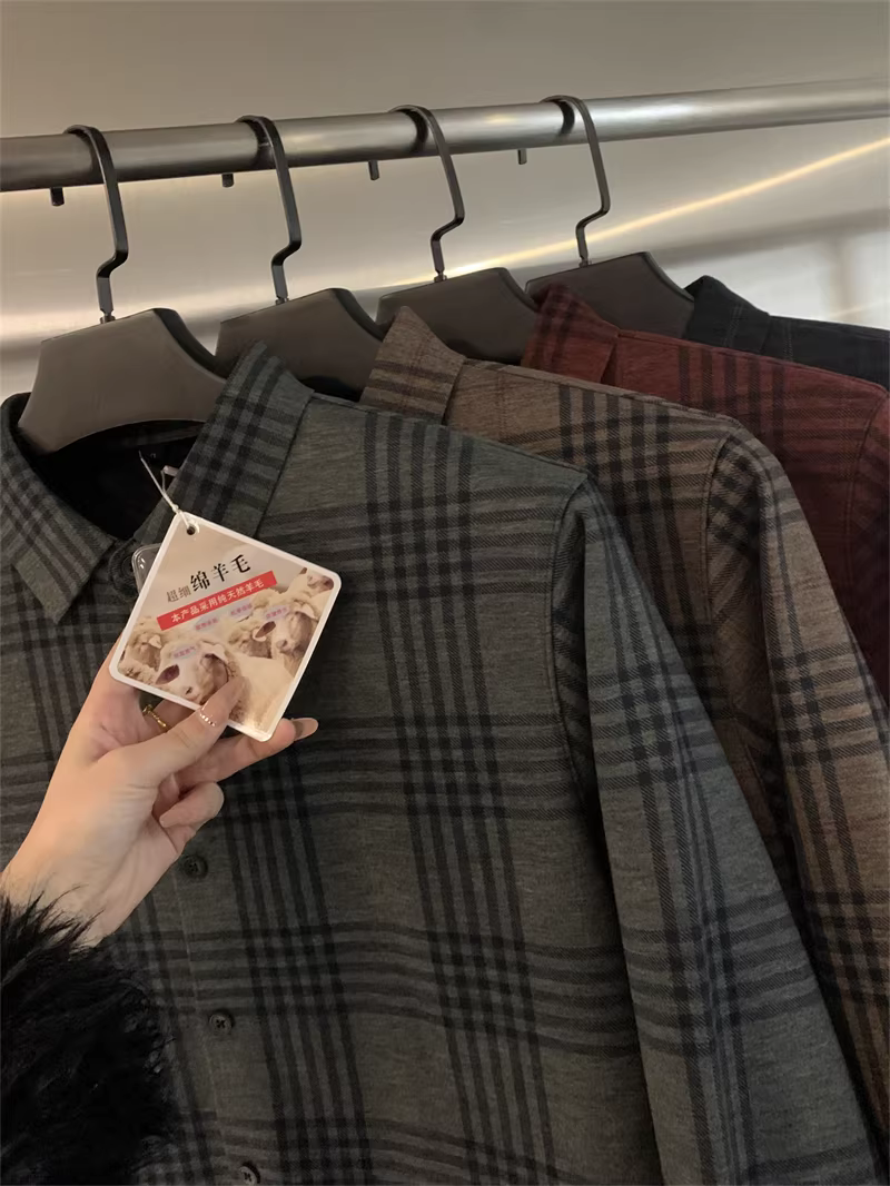 Áo len Don Quixote + pha trộn tơ tằm! Áo sơ mi nam có cổ kẻ sọc ấm áp, lót lông cừu tích hợp mùa thu đông
