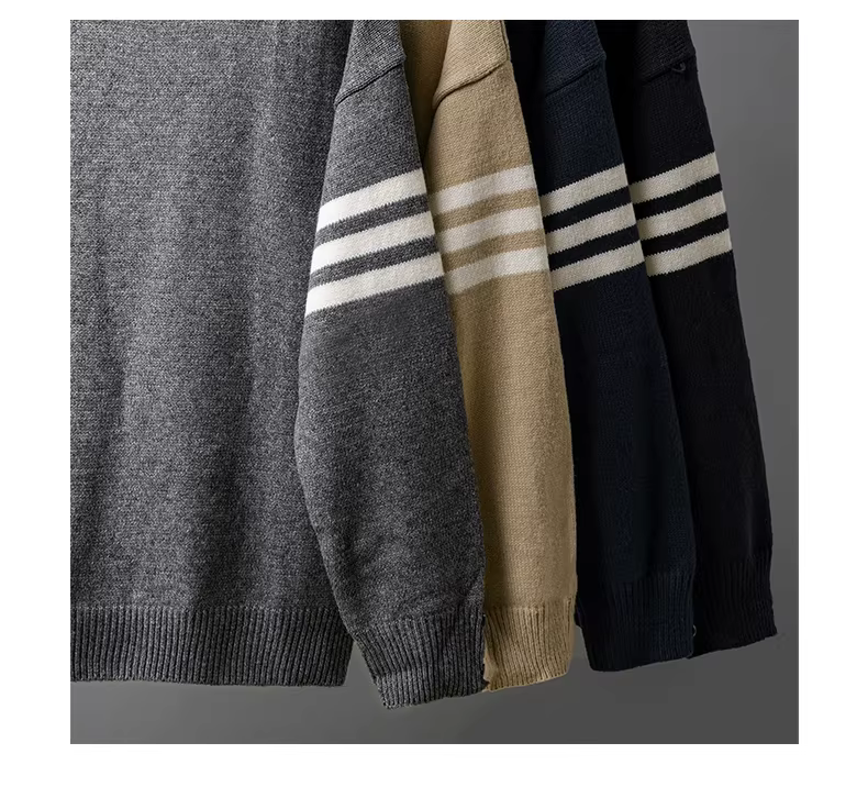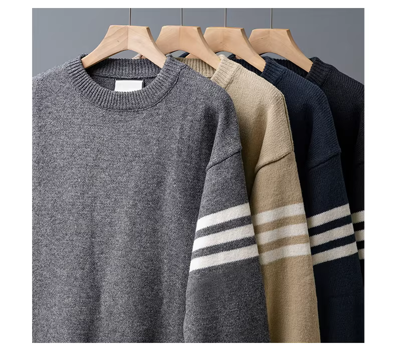 - Áo len nam hạng nặng, áo len ba sọc hợp thời trang phong cách Mỹ mùa đông, phong cách giản dị, dày dặn để giữ ấm, áo dệt kim cổ tròn.