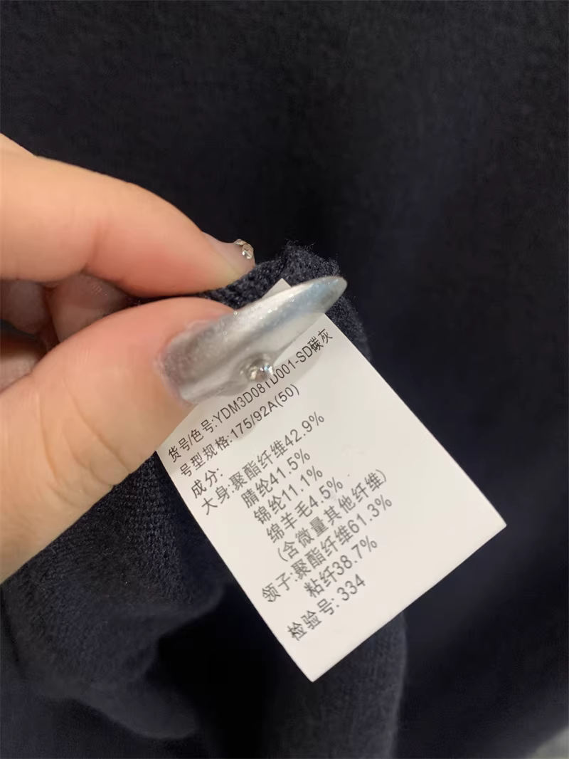 大身:42.9%聚酯纤维+41.5%腈纶+11.1%锦纶+4.5%绵羊毛(含微量其他纤维)