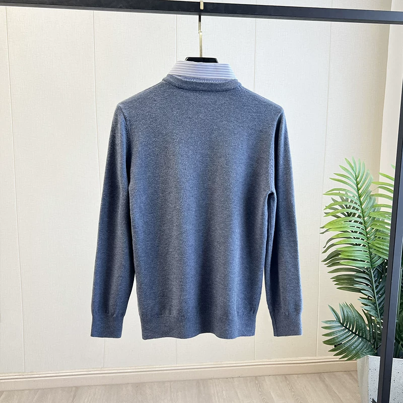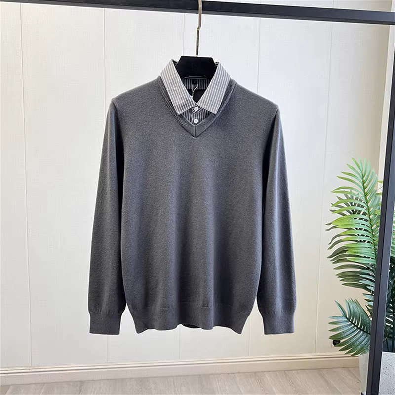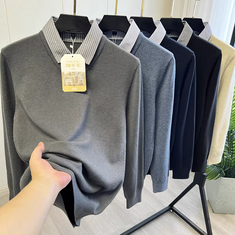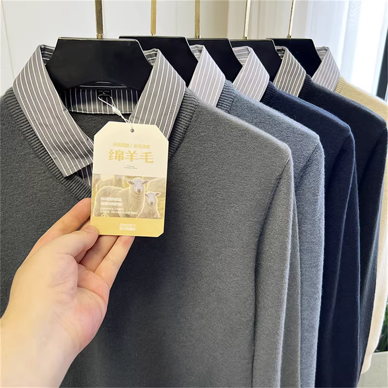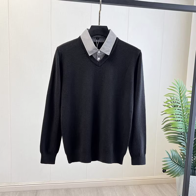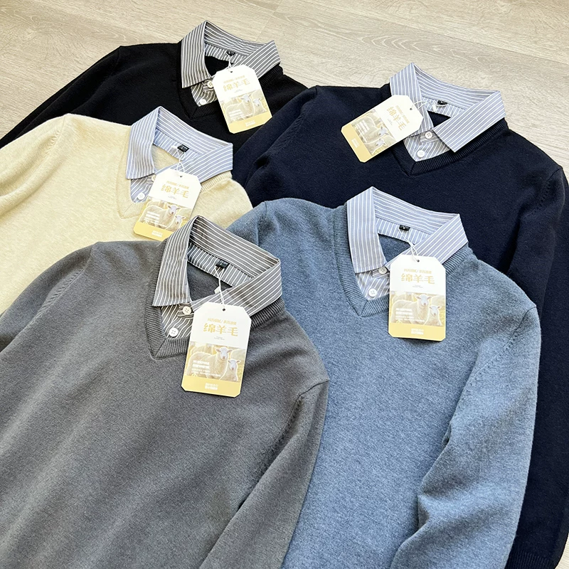 Áo len pha len Don Quixote! Áo len nam phối lông cừu giả hai lớp cổ áo sơ mi mùa thu đông thời trang