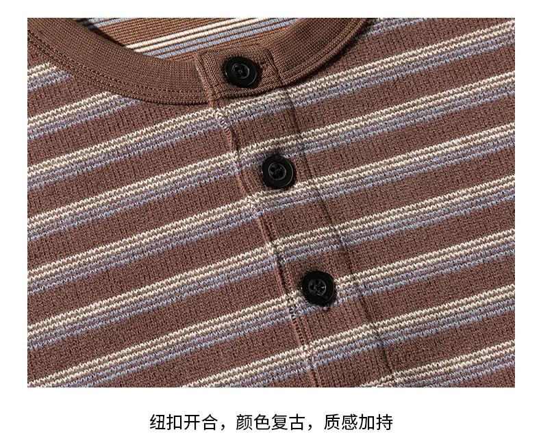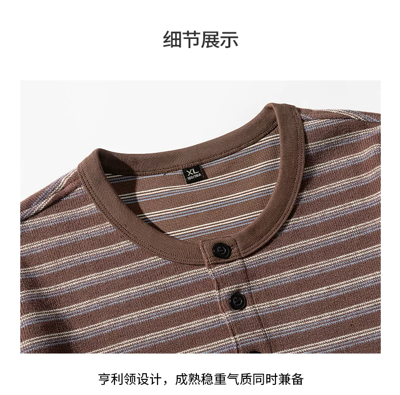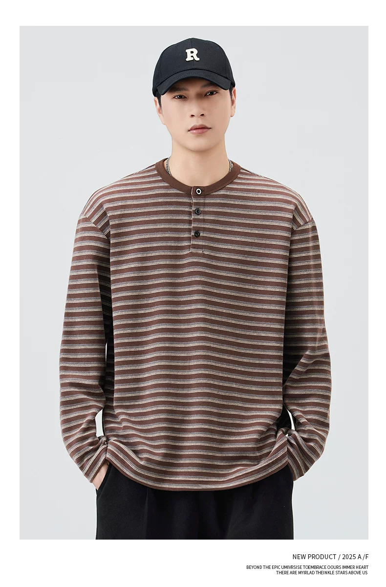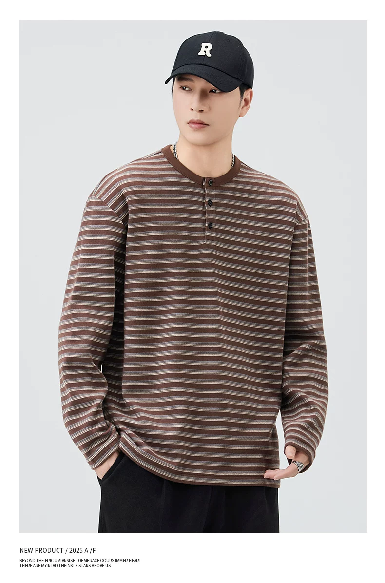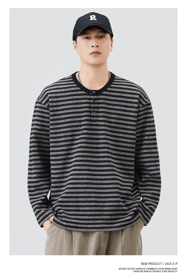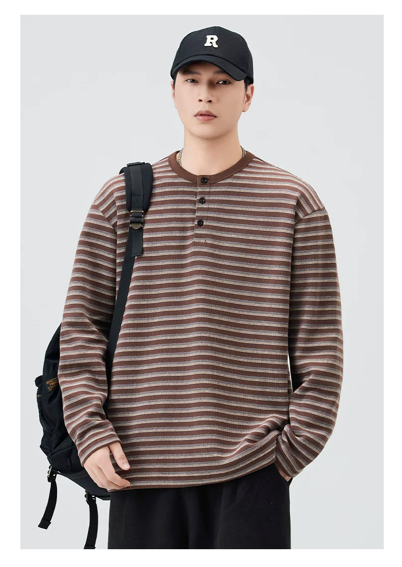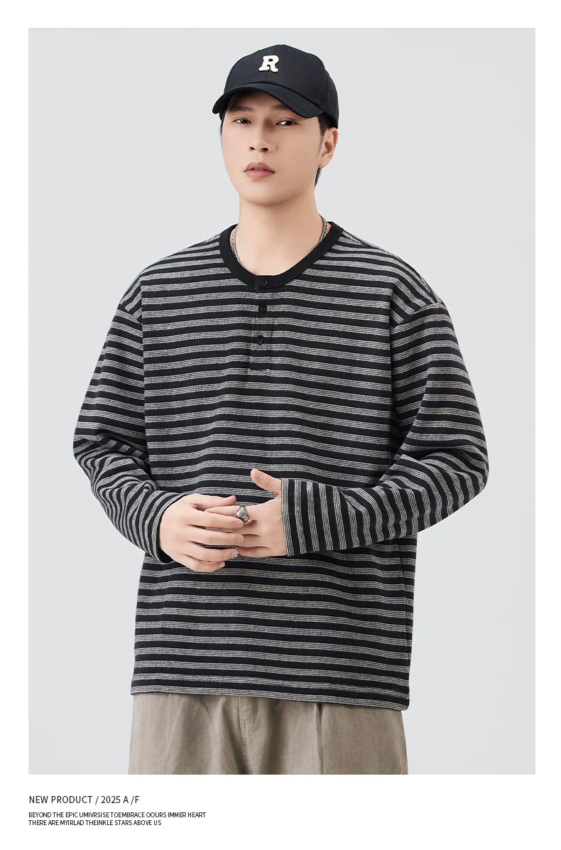Áo len sọc cổ Henry kiểu Mỹ của OMZM dành cho nam, áo sơ mi cơ bản dài tay đơn giản, đa năng, mới, thoải mái cho mùa thu đông.