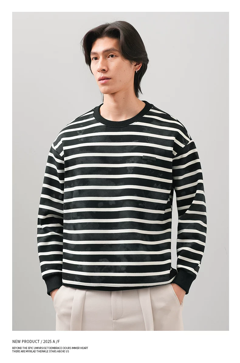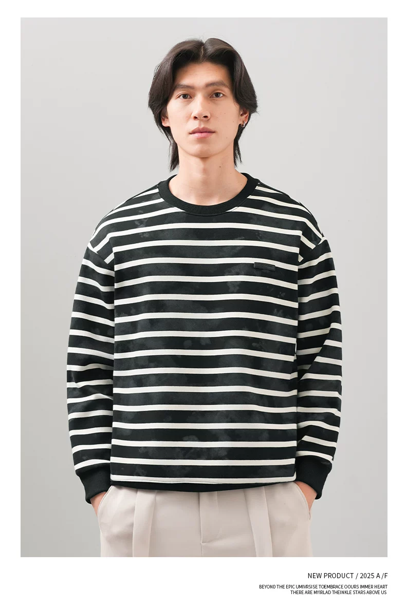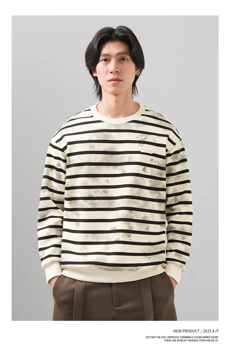 Áo len sọc kiểu Mỹ OMZM dành cho nam, áo khoác dài tay cổ tròn phối màu mùa thu đông 2025, áo lót nhuộm chàm thời thượng mới
