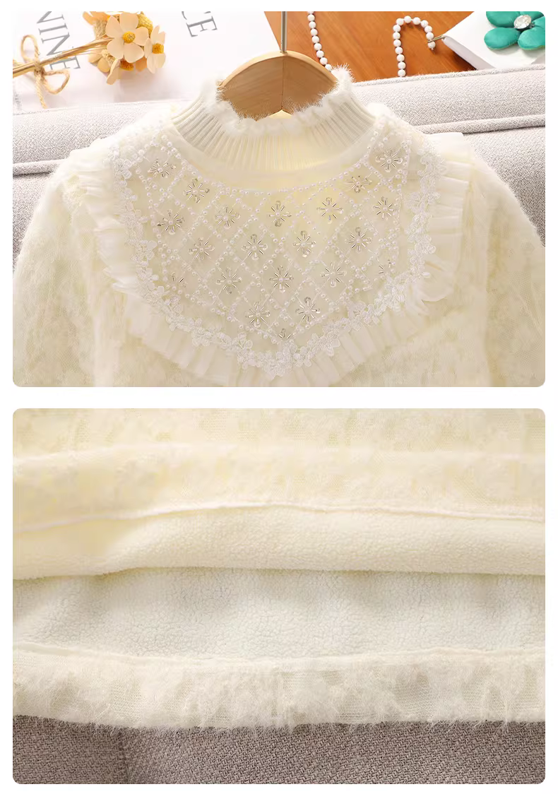 Áo lót lông cừu bé gái kiểu mới 2025, áo bé gái cổ nửa cao phối ren, áo nỉ dày giữ ấm mùa thu đông