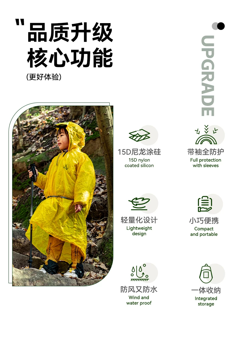 - Áo mưa di động siêu nhẹ ngoài trời dành cho trẻ em Áo mưa toàn thân được phủ silicon 15D bằng nylon đi bộ đường dài và leo núi dành cho người lớn có tay áo