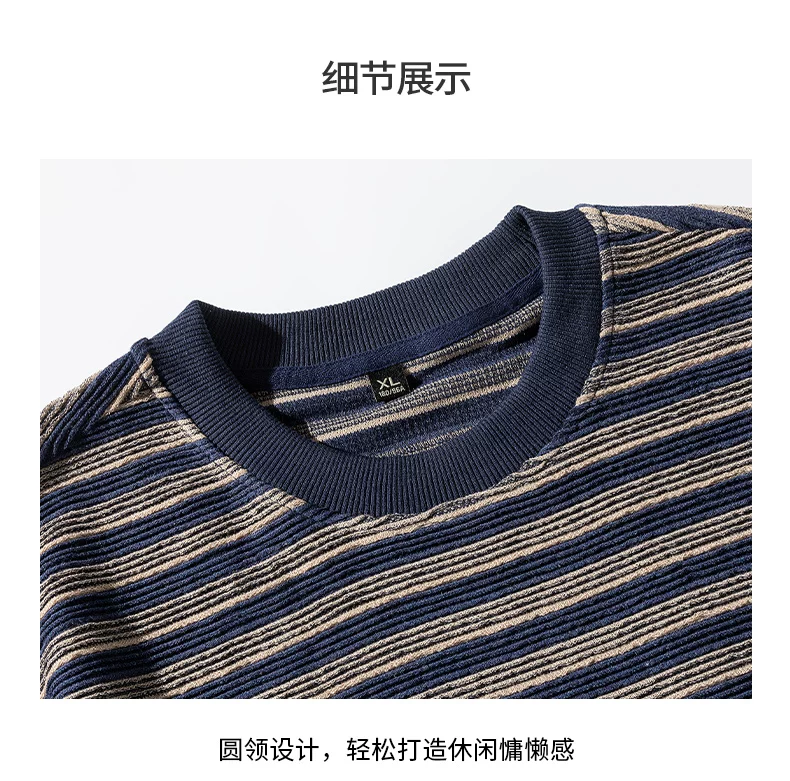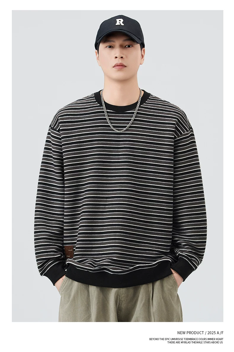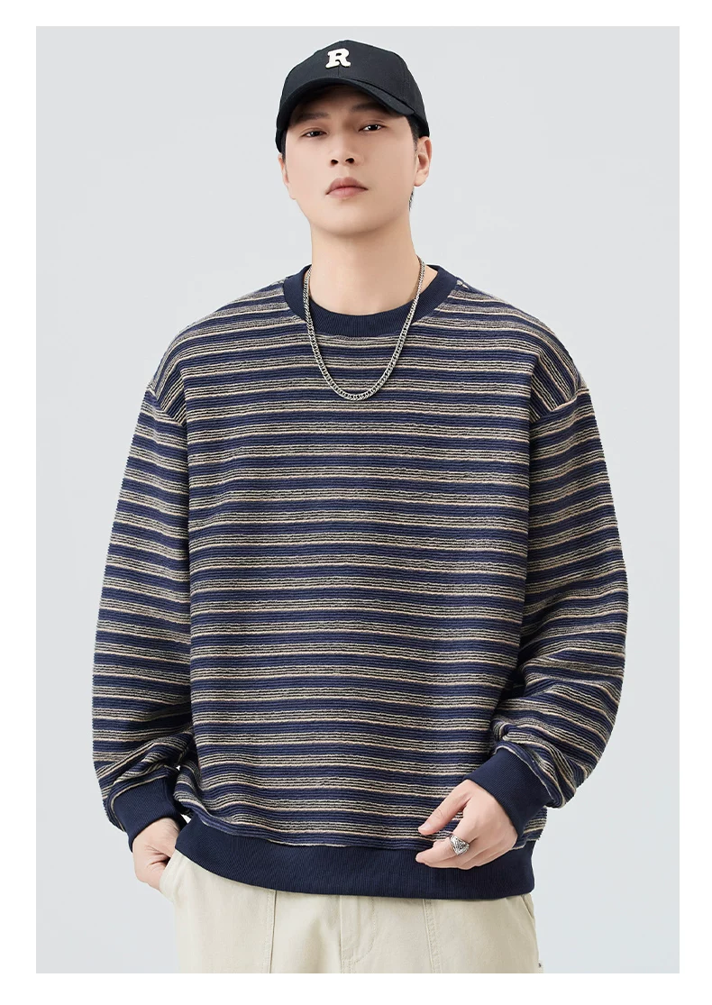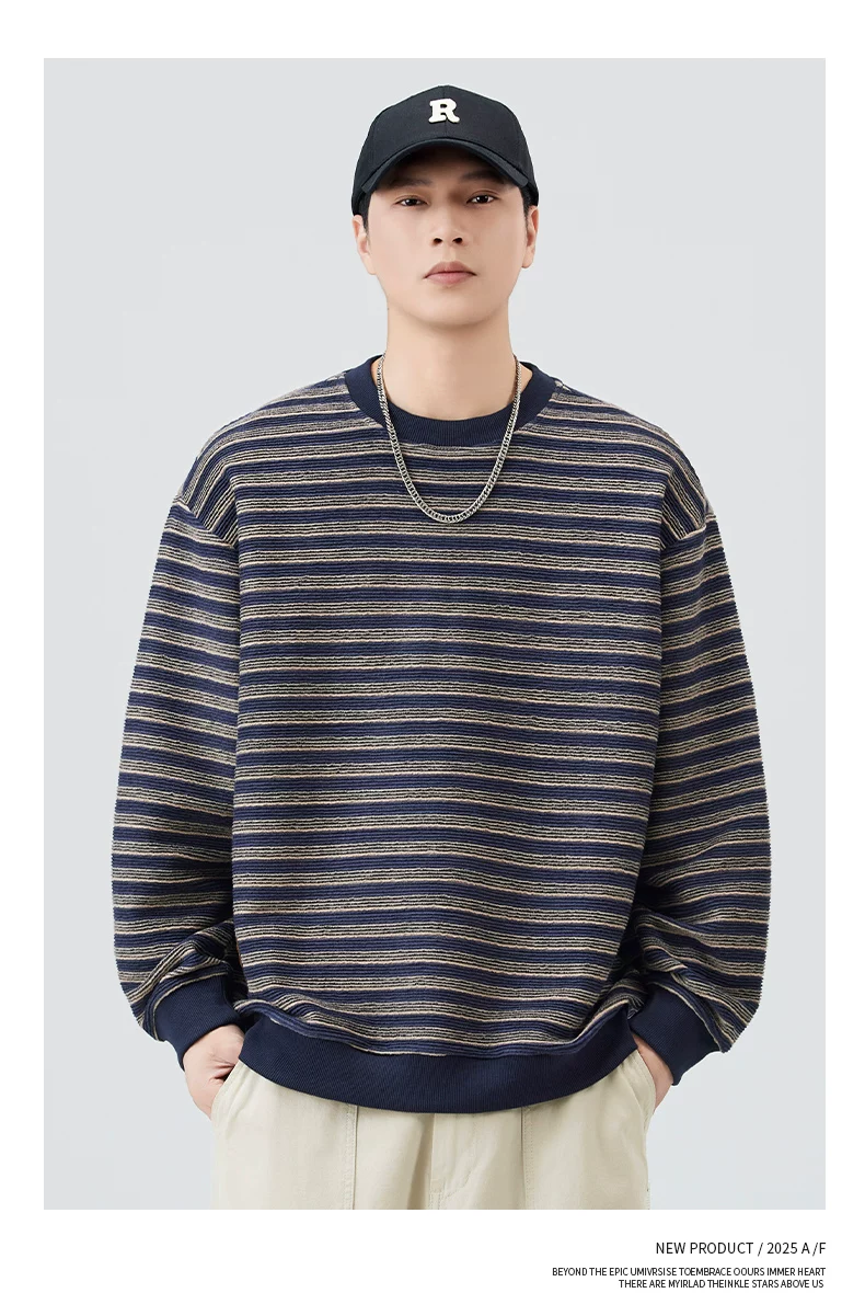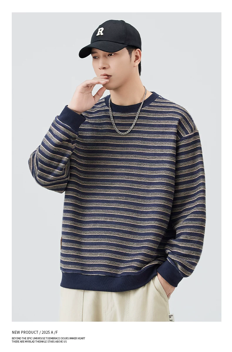 Áo nỉ cổ tròn sọc nặng ký OMZM350G dành cho nam, áo sơ mi dài tay phối màu cổ điển kiểu Mỹ mùa thu đông, áo khoác rộng