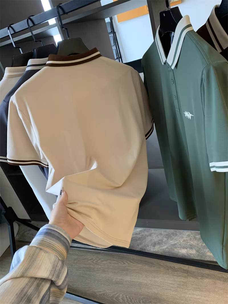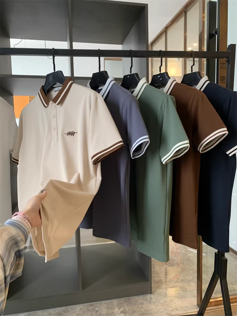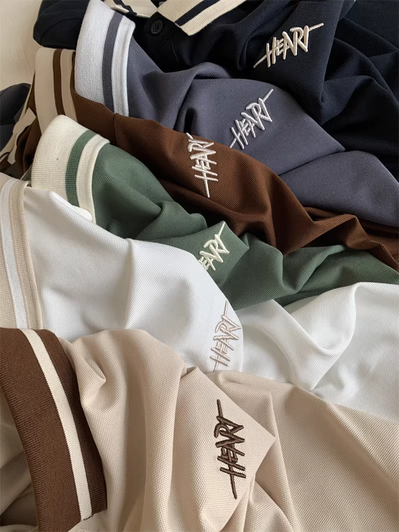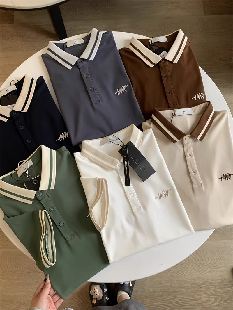 Áo Polo nam tay ngắn phối màu phong cách business casual, chất liệu cotton lưới Pique, thêu chữ tinh tế theo phong cách Don Quixote.