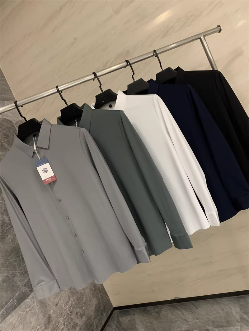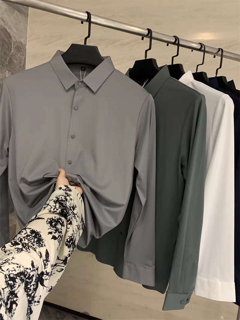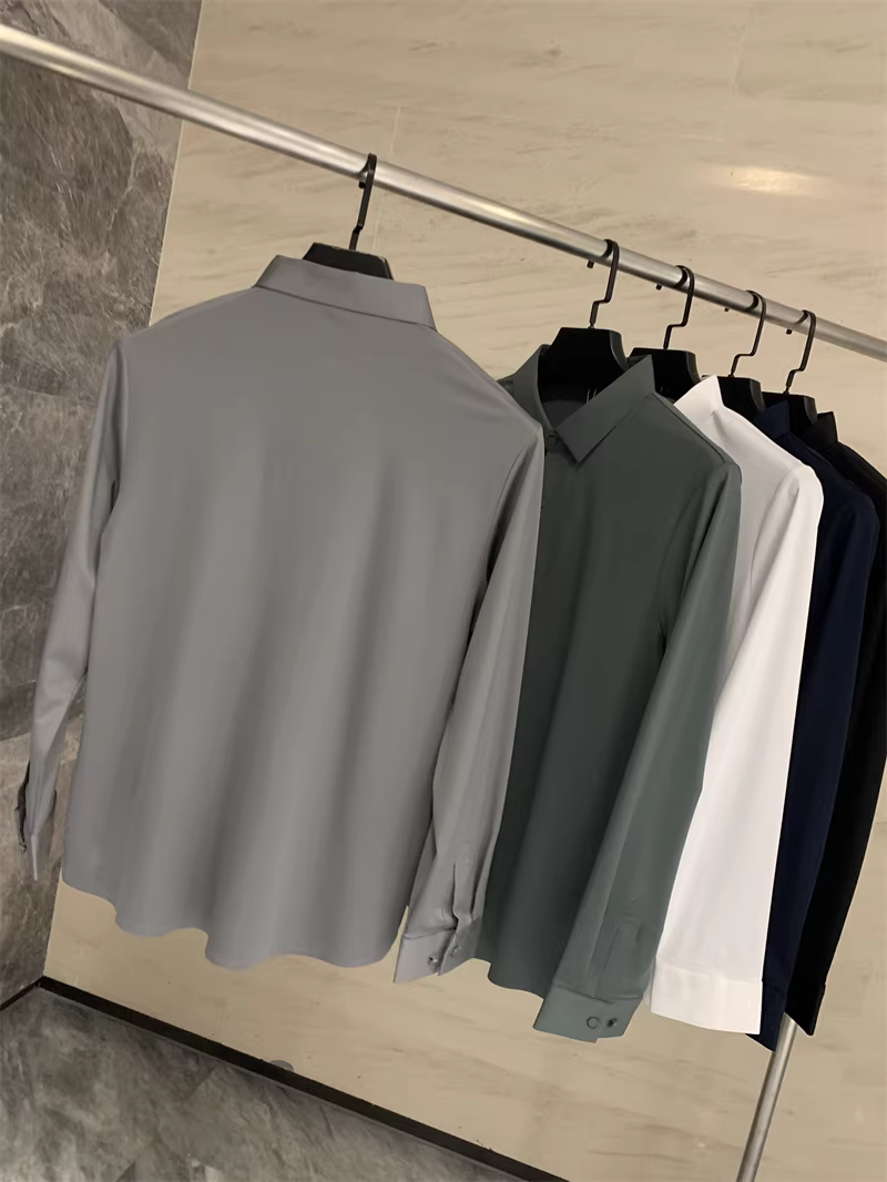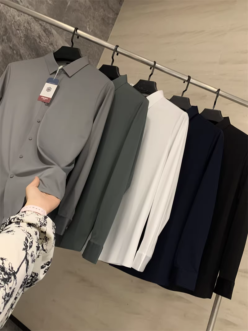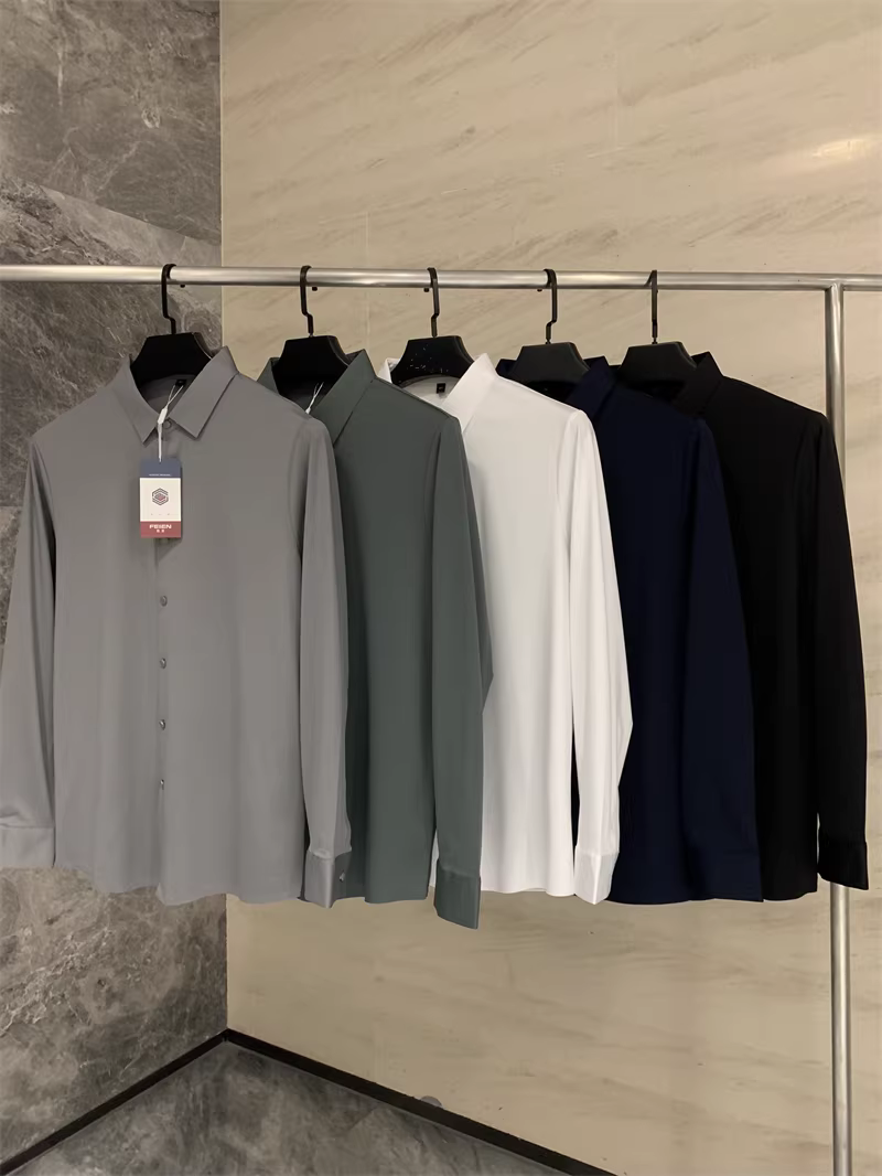 Áo sơ mi nam chất liệu lụa mềm mại, màu trơn, cổ trụ, cắt laser liền mạch, không đường may, theo đơn đặt hàng Don Quixote ODM!