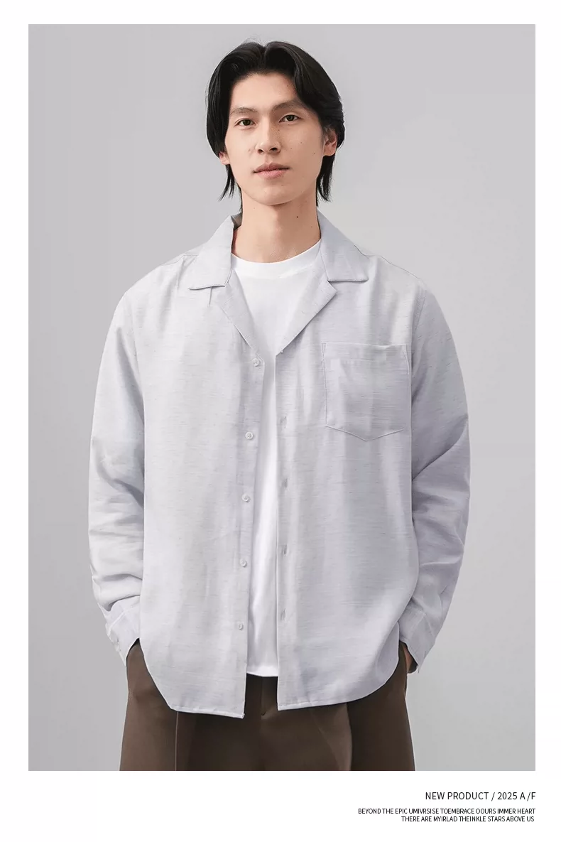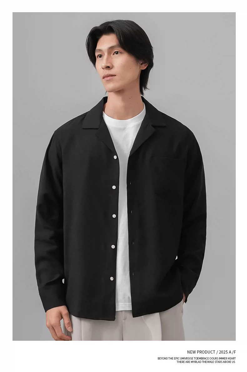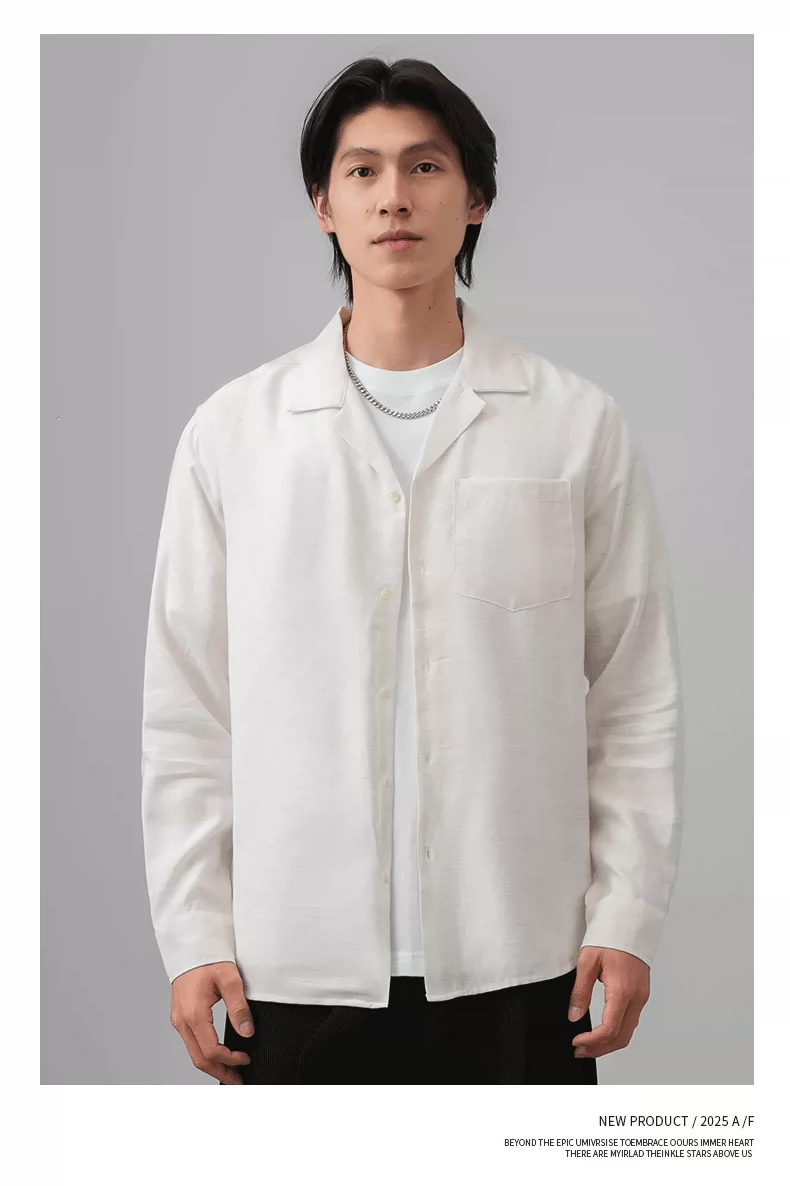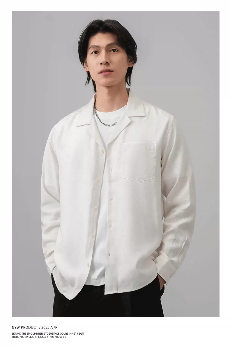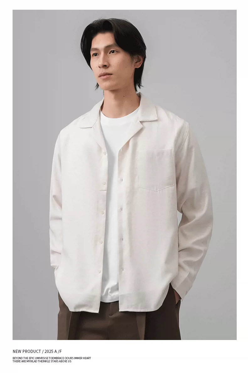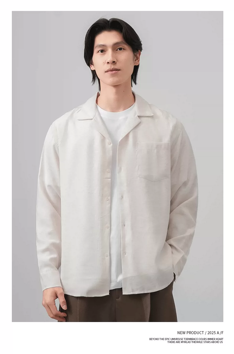 Áo sơ mi nam OMZM kiểu tiền cổ điển, chất liệu vải lanh, tay dài, mùa thu, cổ Cuba, màu trơn, dáng rộng, kiểu áo khoác.