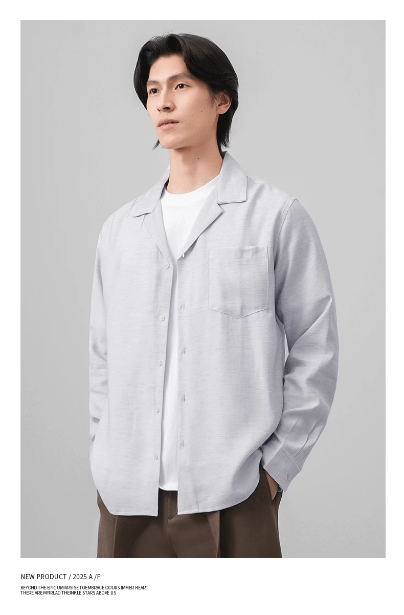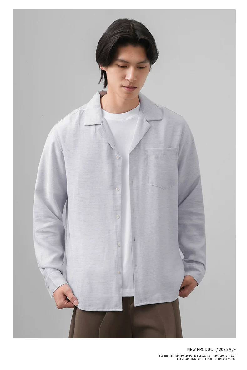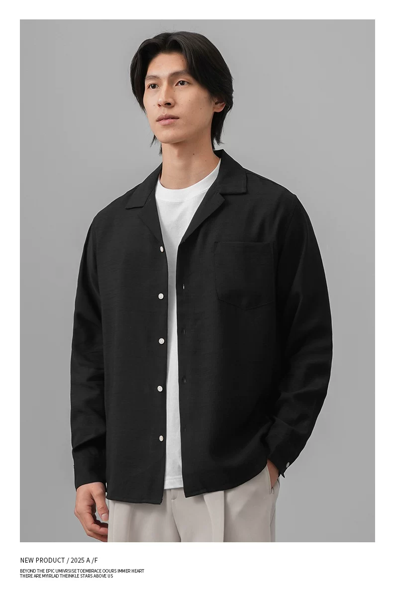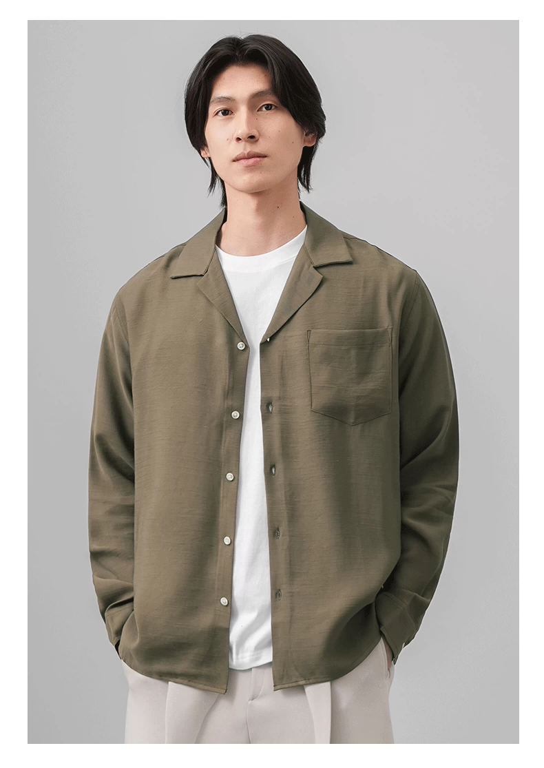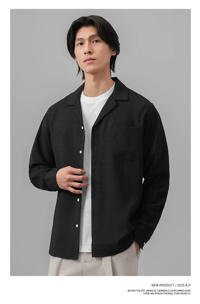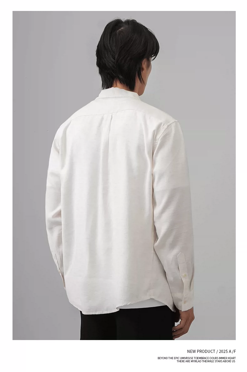 Áo sơ mi nam OMZM kiểu tiền cổ điển, chất liệu vải lanh, tay dài, mùa thu, cổ Cuba, màu trơn, dáng rộng, kiểu áo khoác.