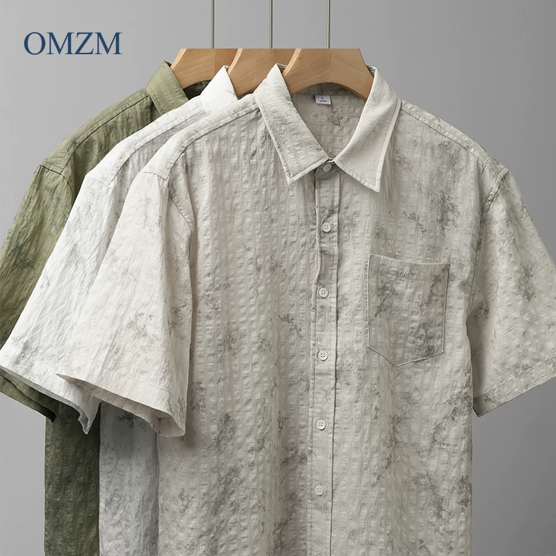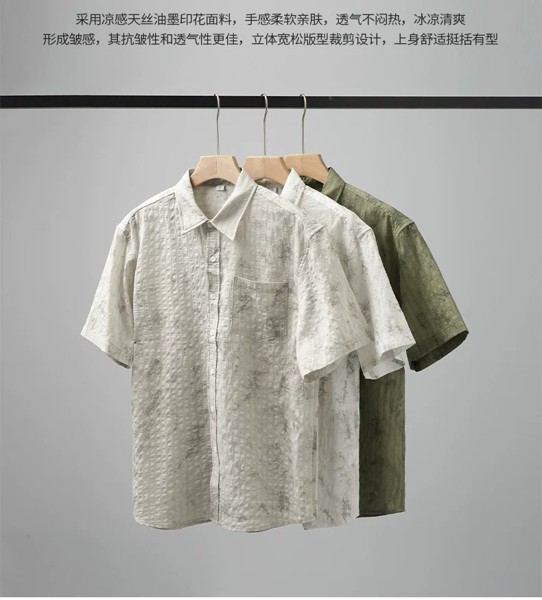 Áo sơ mi ngắn tay phong cách Hawaii OMZM dành cho nam, áo sơ mi Tencel mát mẻ mùa hè, in tranh mực, áo sơ mi dáng rộng chống nhăn