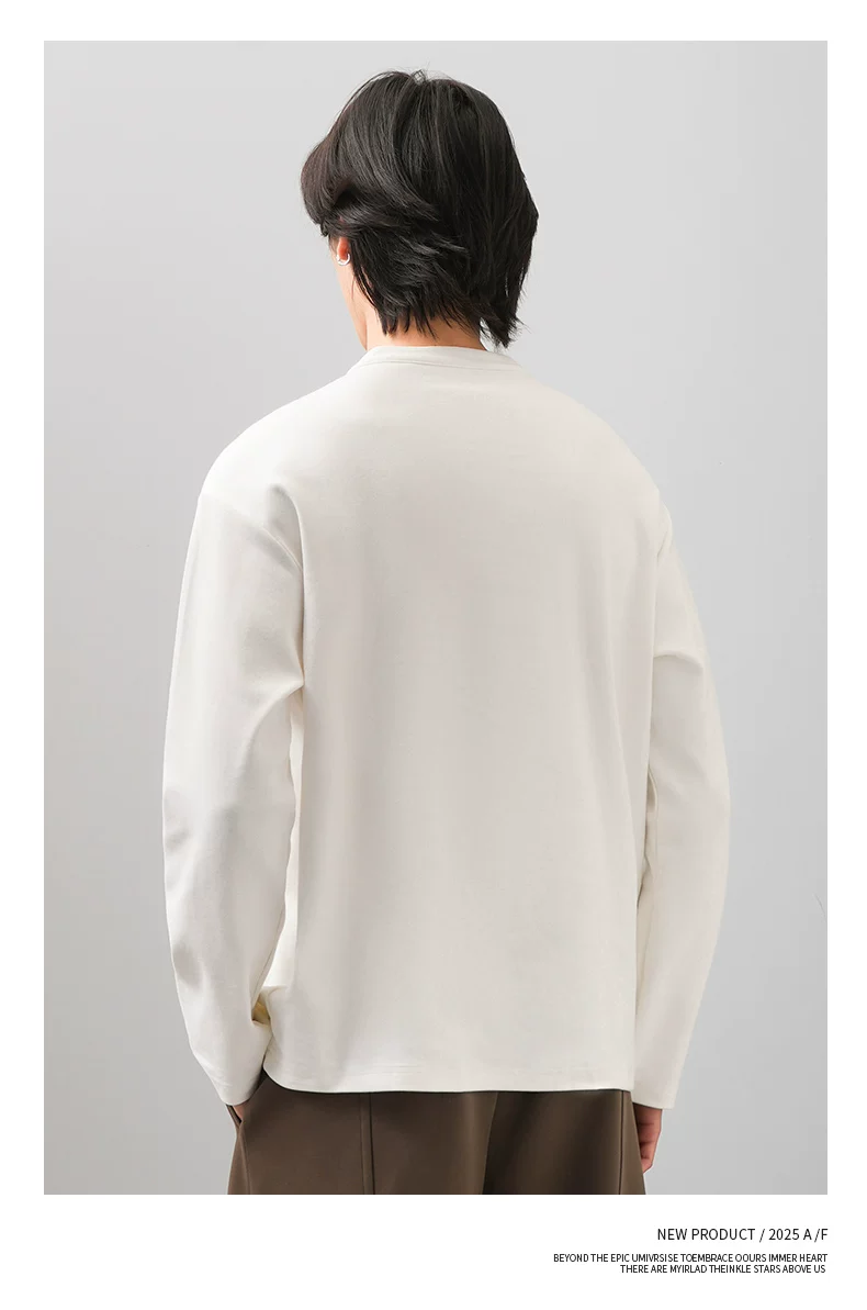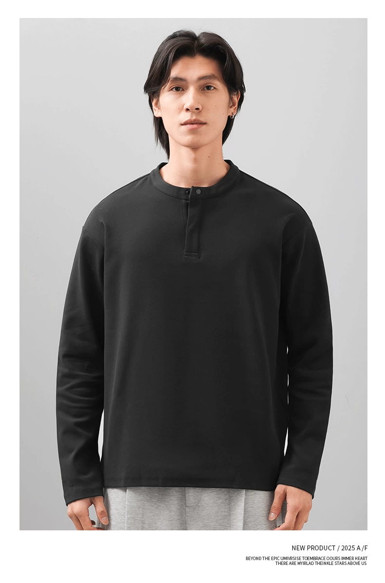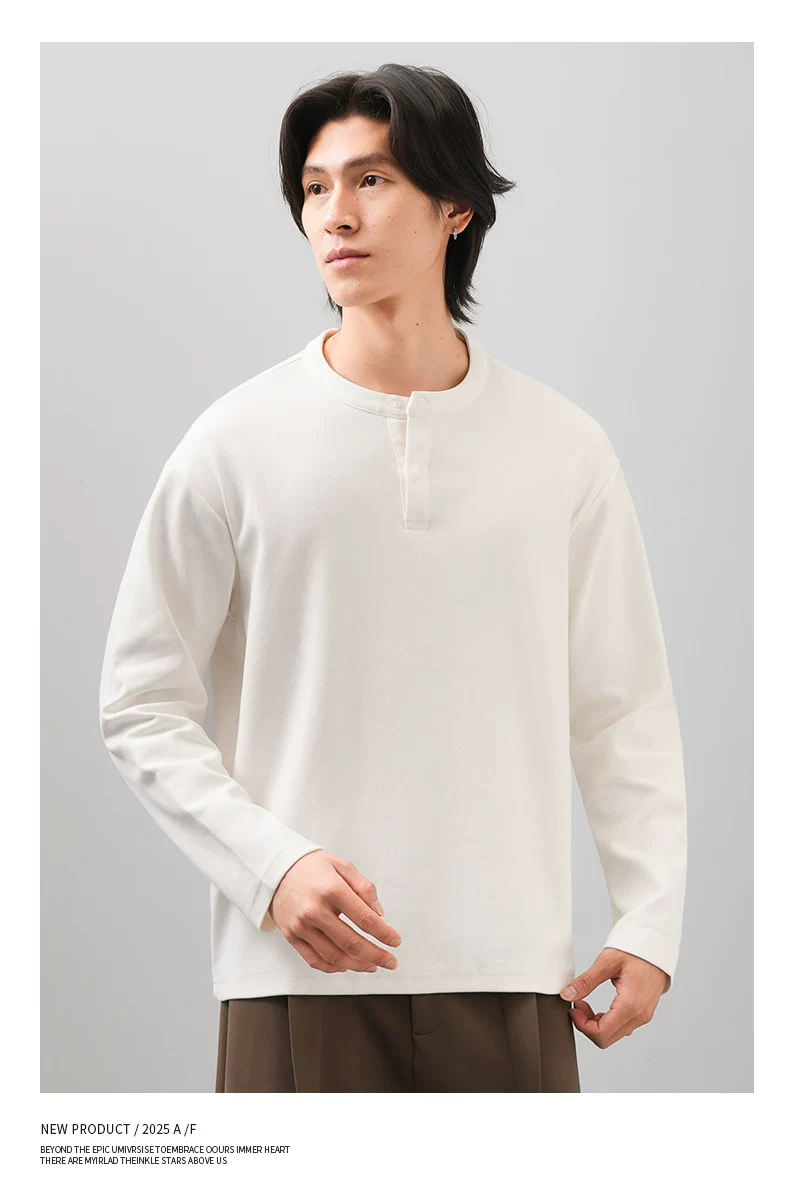 Áo thun cổ henley hạng nặng OMZM300G dành cho nam, tay dài, áo nỉ đơn giản phong cách Mỹ mùa thu, áo sơ mi trắng phong cách tiền cổ điển.