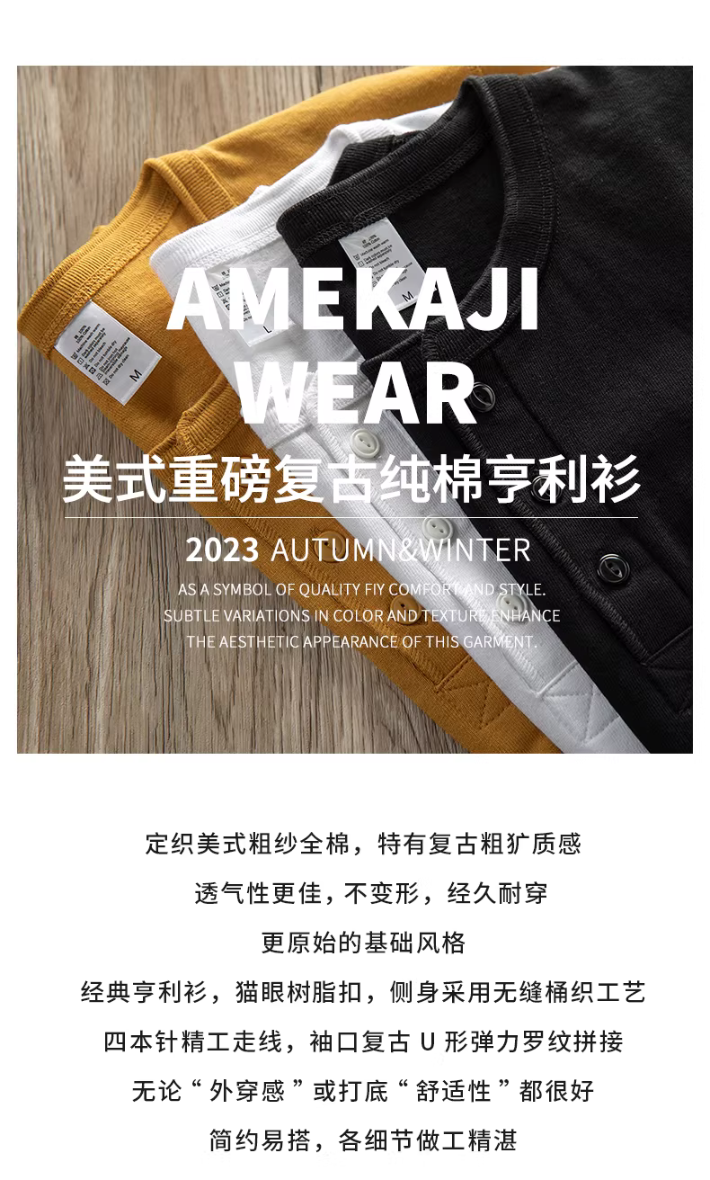 - Áo thun cổ henley tay dài cổ điển kiểu Mỹ nguyên chất dành cho nam, áo henley ba đường may màu trơn thu đông chất liệu cotton nguyên chất.
