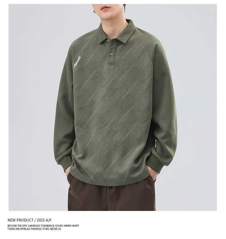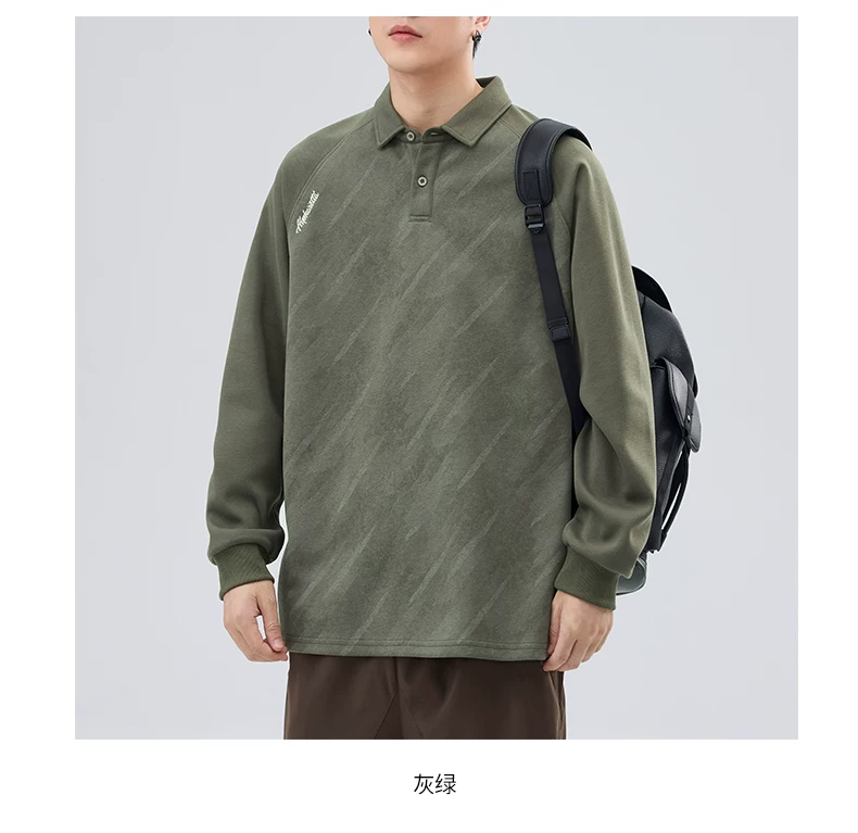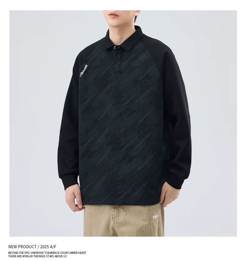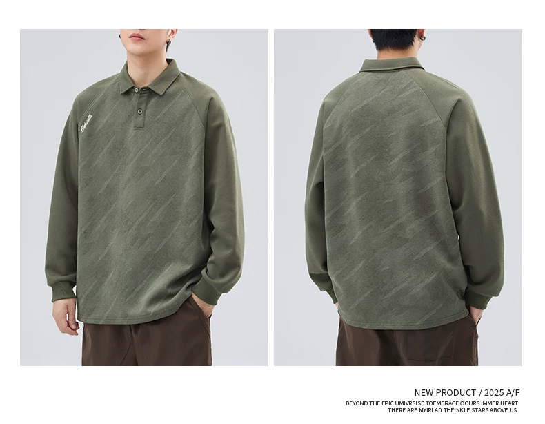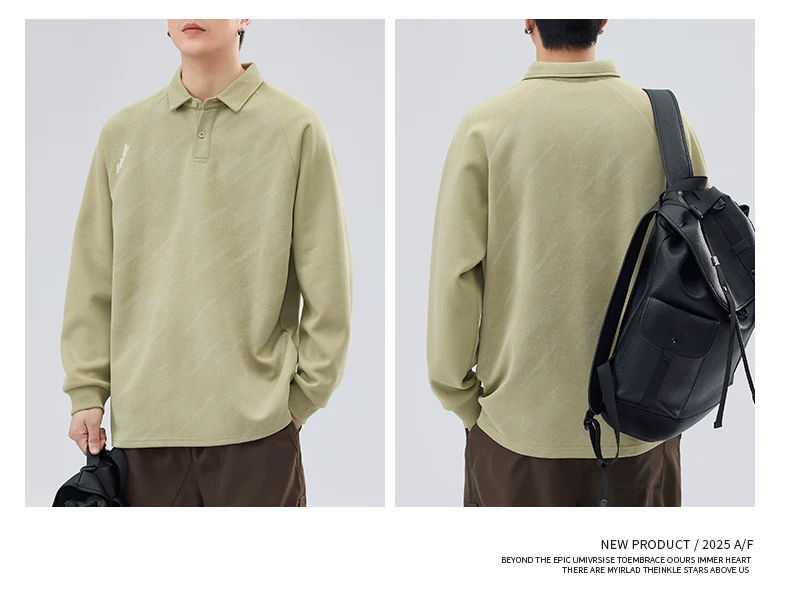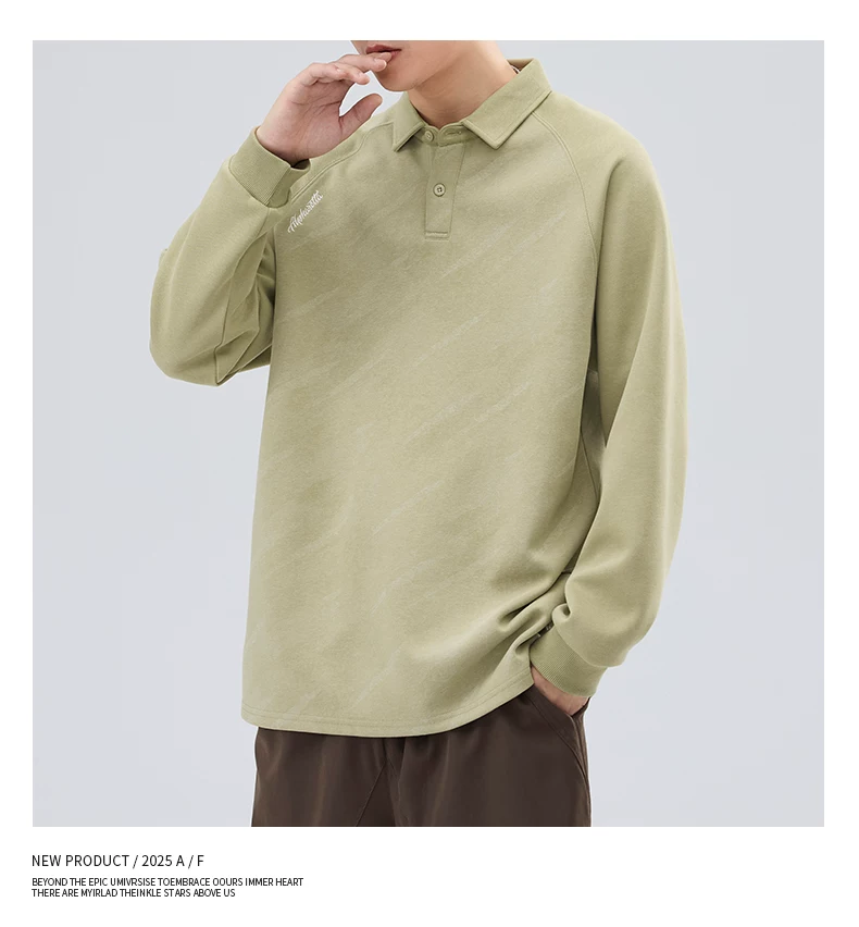 - Áo thun cổ polo hạng nặng OMZM320G dành cho nam, áo thun tay raglan thêu họa tiết mùa thu, dáng rộng, tay dài in hình