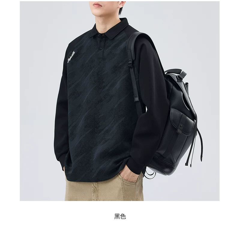 Áo thun cổ polo hạng nặng OMZM320G dành cho nam, áo thun tay raglan thêu họa tiết mùa thu, dáng rộng, tay dài in hình