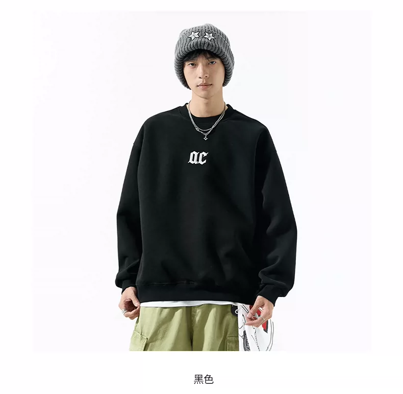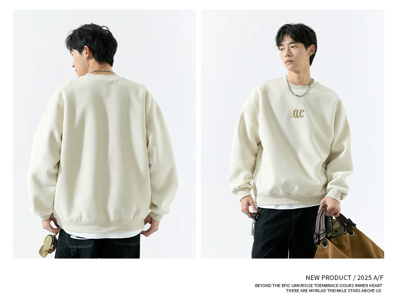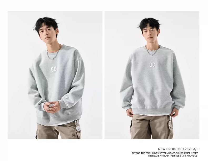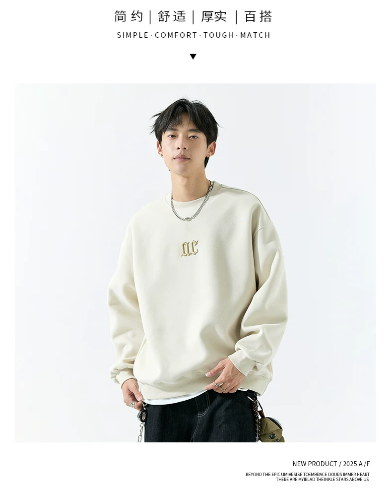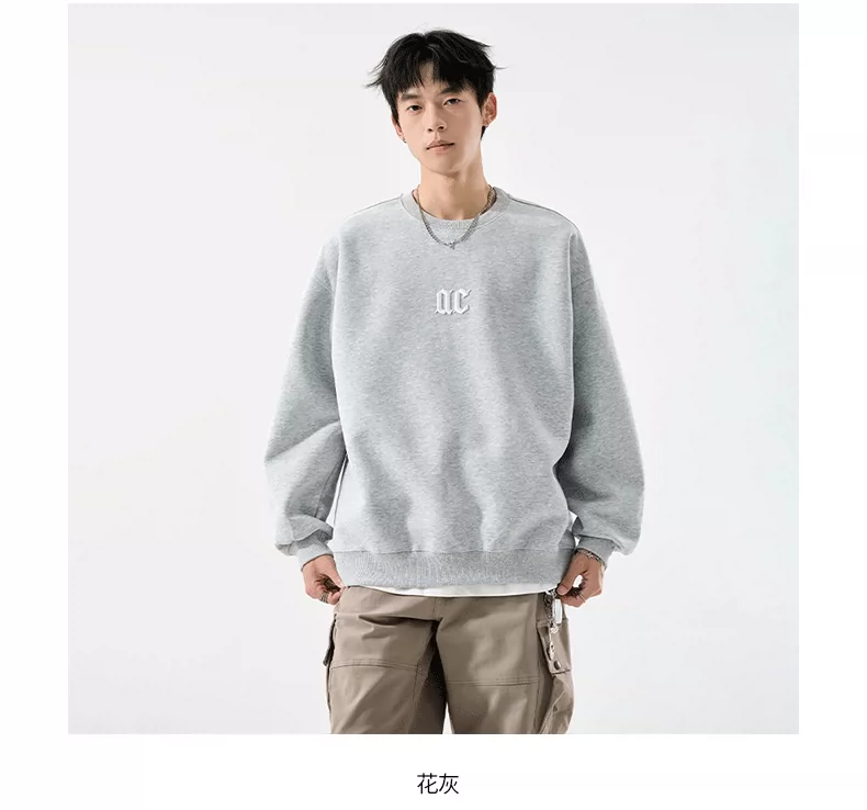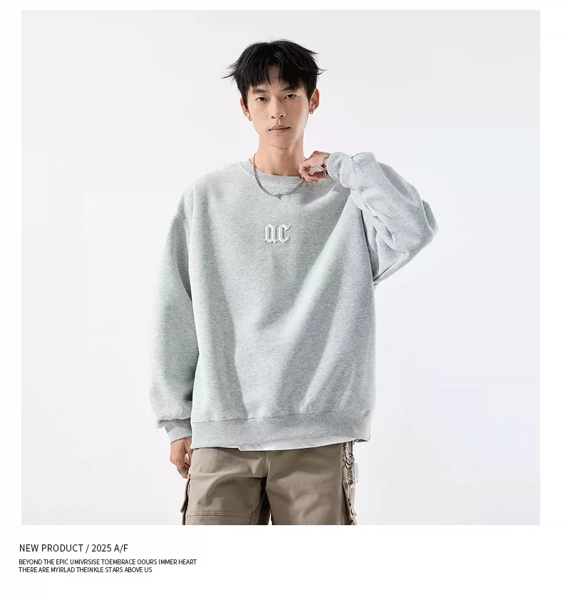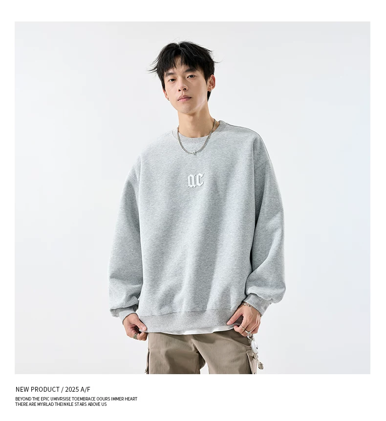 - Áo thun cổ tròn hạng nặng OMZM450G dành cho nam, mùa thu phong cách Mỹ thêu chữ lớp bên trong áo sơ mi không có mũ trùm đầu