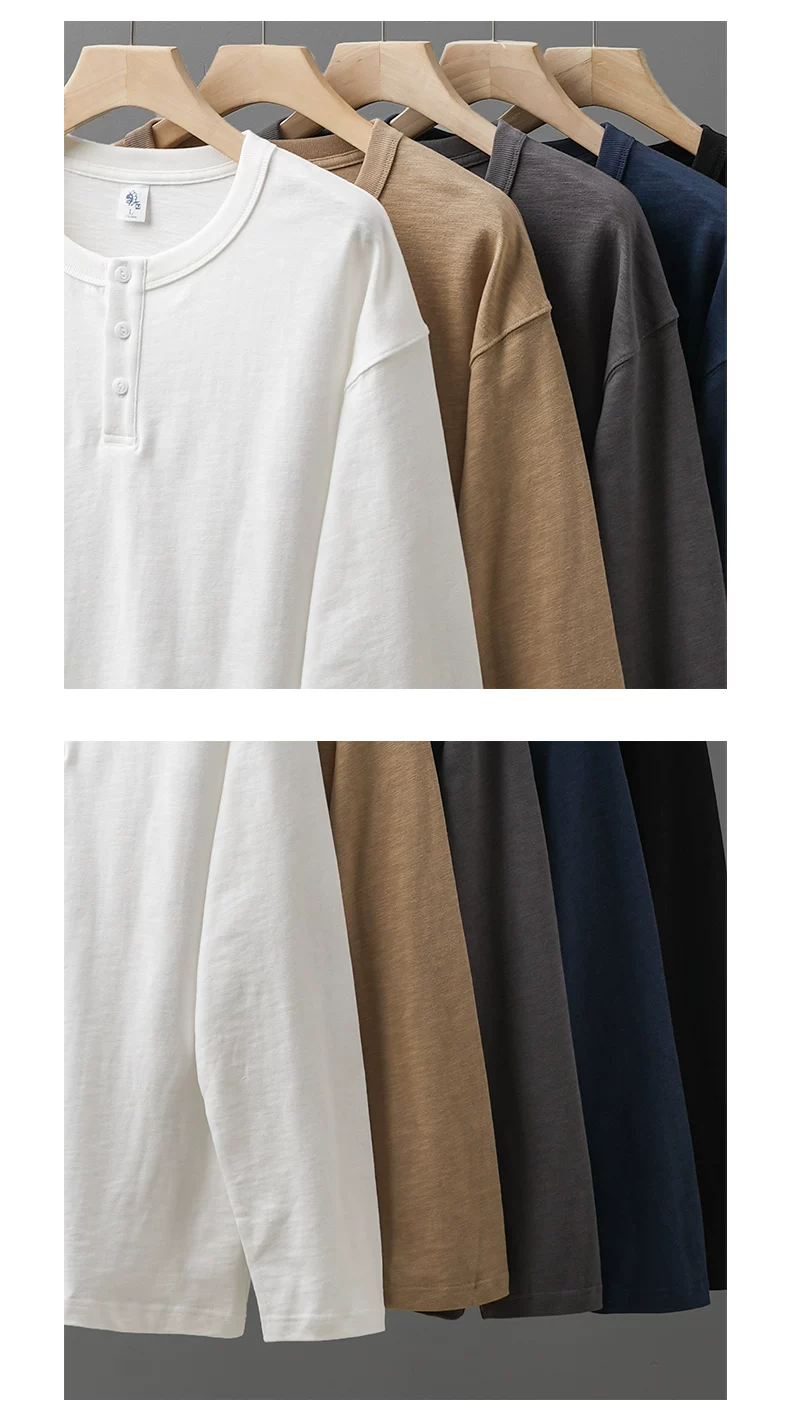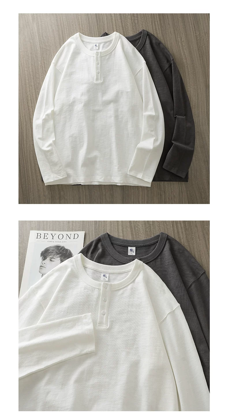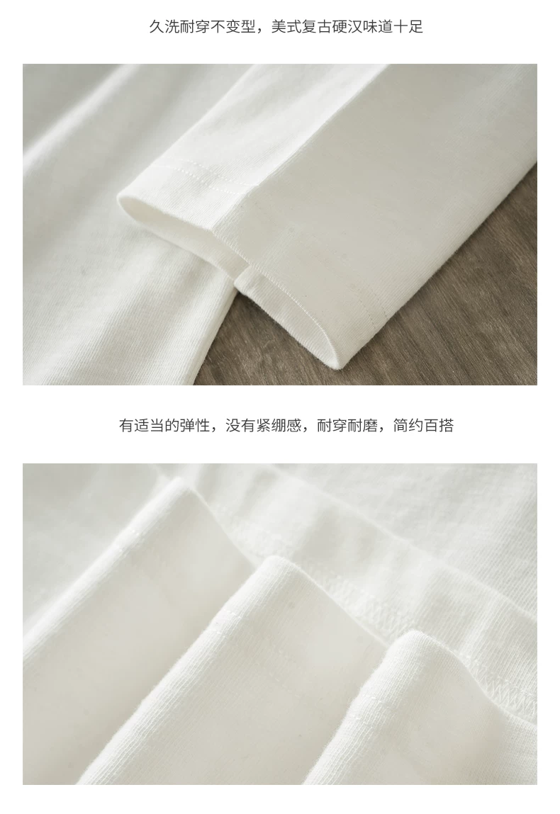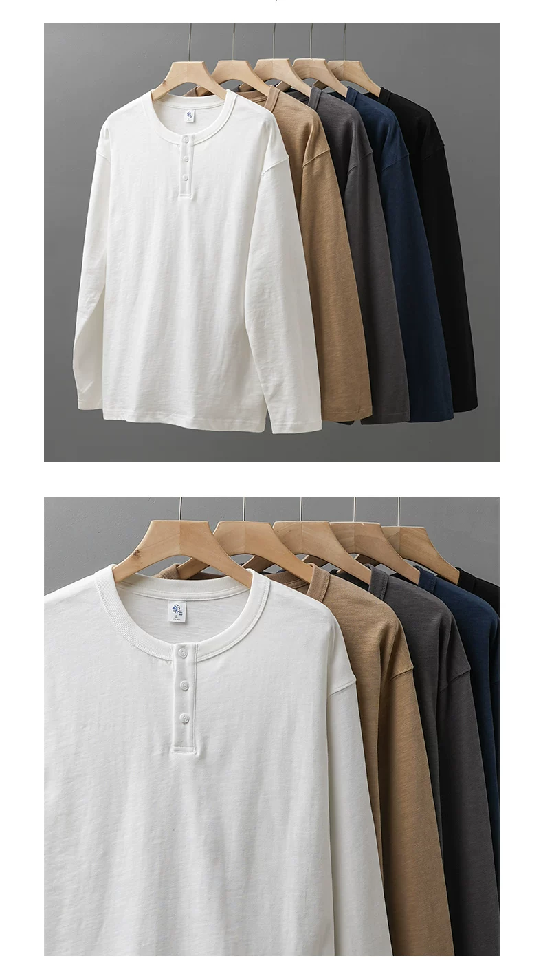 Áo thun cổ trụ Henry 400g dành cho nam, tay dài, kiểu dáng thu đông Mỹ, chất liệu cotton nguyên chất, áo thun trơn màu trắng ba kim.
