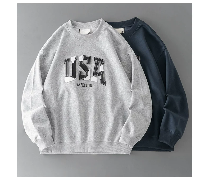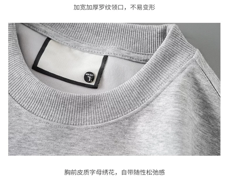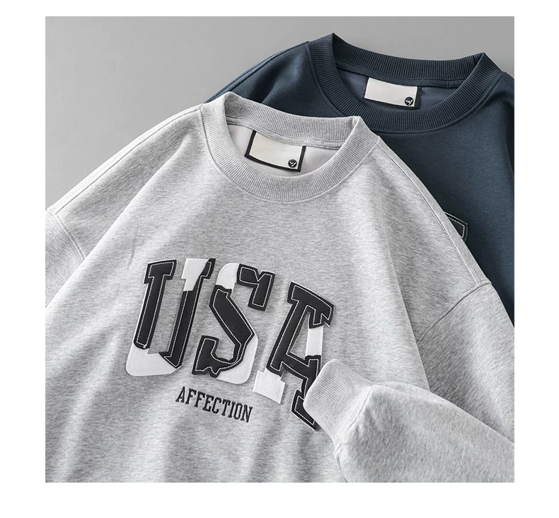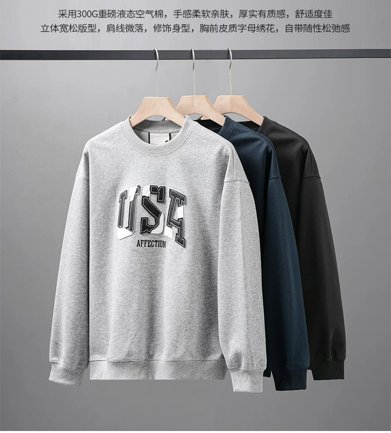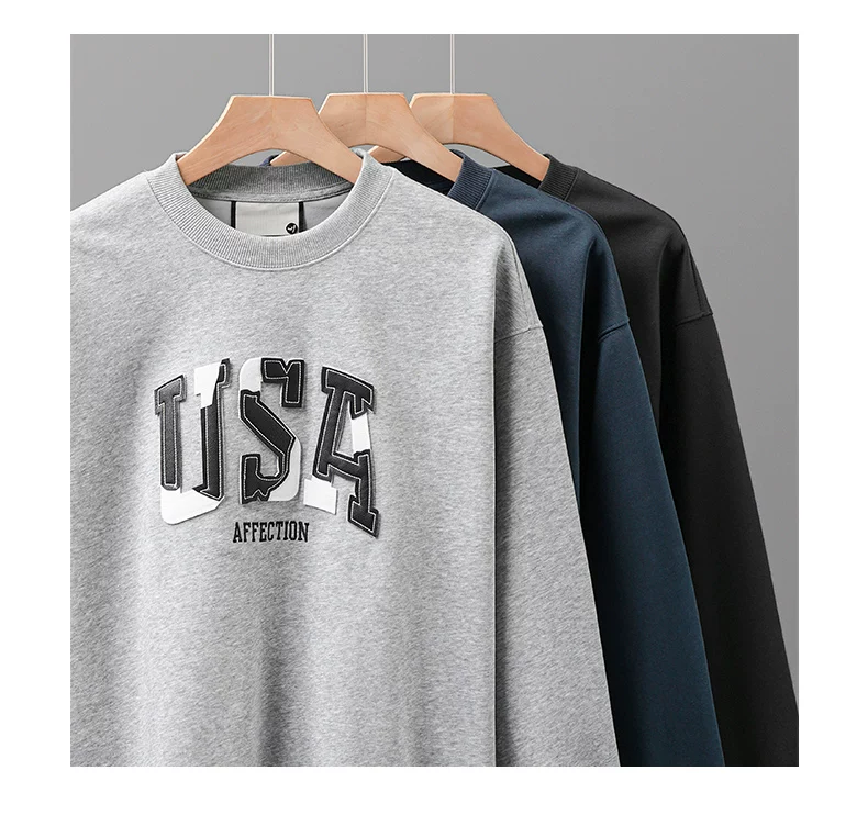 - Áo thun cotton hạng nặng OMZM300G dành cho nam, áo thun dài tay cổ tròn thêu phong cách Mỹ mùa thu kiểu dáng rộng vai