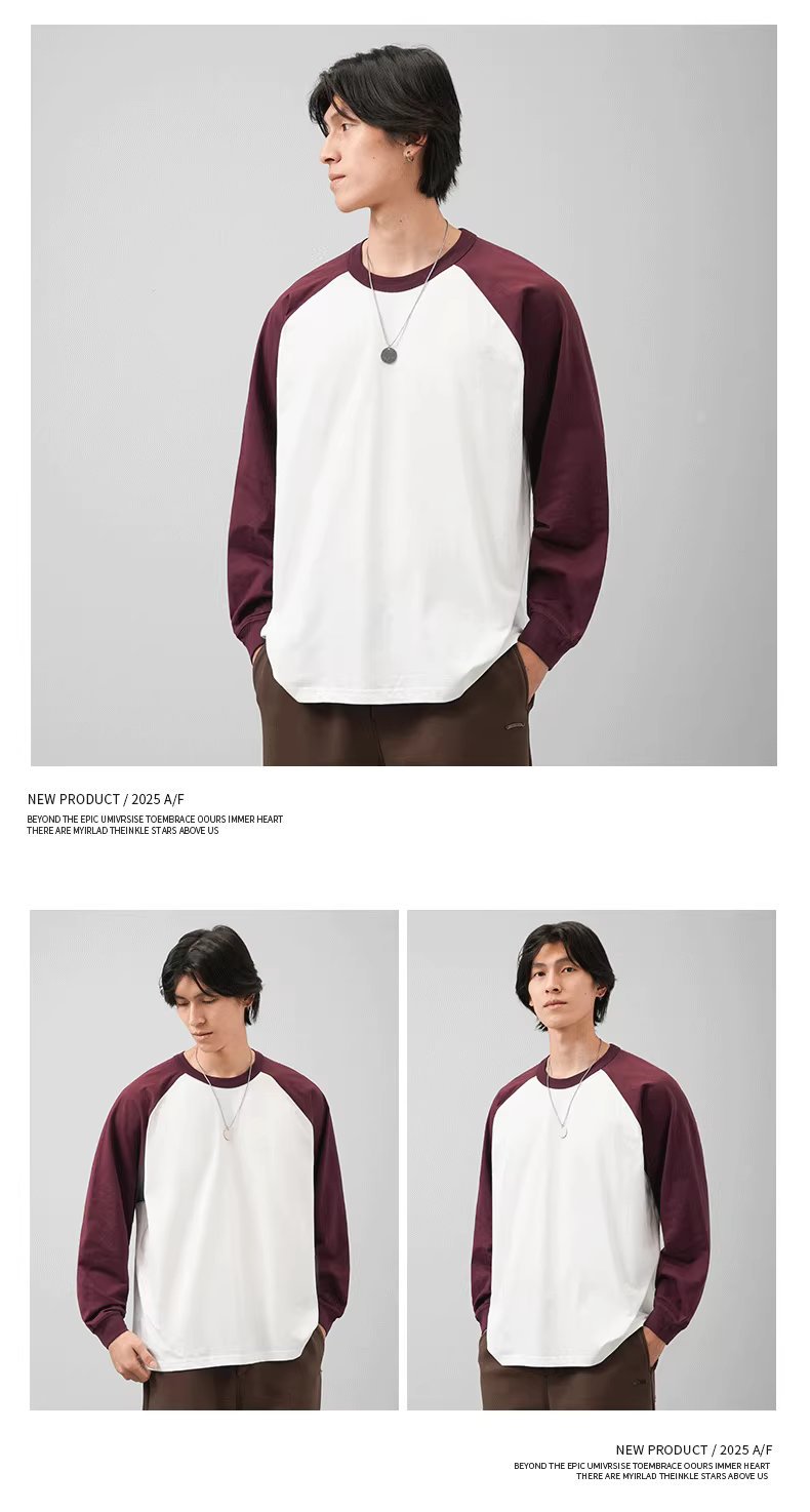 - Áo thun cotton nguyên chất 230G tay raglan dày dặn dành cho nam, tay dài, mùa xuân và mùa thu, phong cách Mỹ, phối màu, cổ tròn, áo thun cotton nguyên chất, áo nỉ.